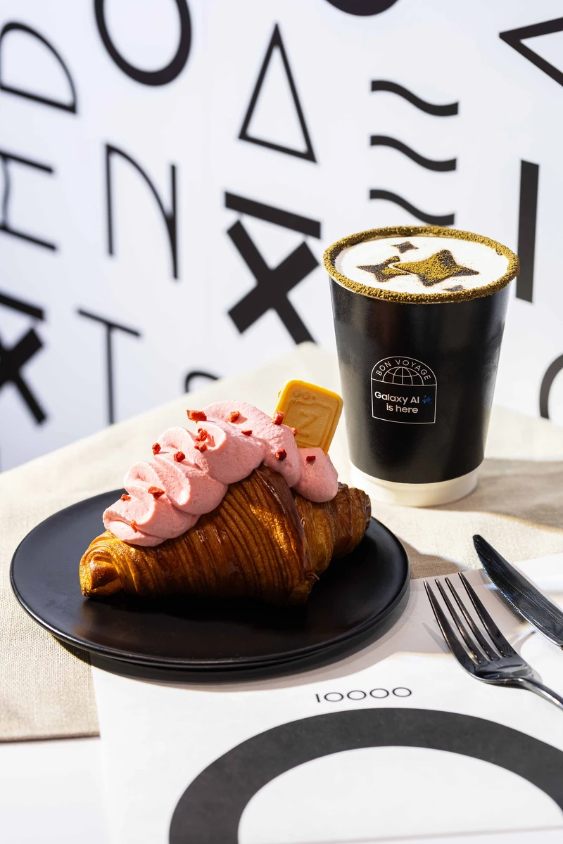 除了創意打卡區外,當然也少不了聯名甜品,這次推出兩款浪漫風味甜點 「Galaxy Z 開心果鮮奶油可頌」與「Galaxy Z 莓果鮮奶油可頌」,呈現出Galaxy Z Flold6及Galaxy Z Flip6的機身繽紛配色,另外還獨家推出「Galaxy AI 焙茶奶霜淡咖啡」,淋上香濃的奶蓋,並以「Galaxy AI」LOGO形狀的焙茶粉裝飾於咖啡表面,每一個細節都充滿巧思。