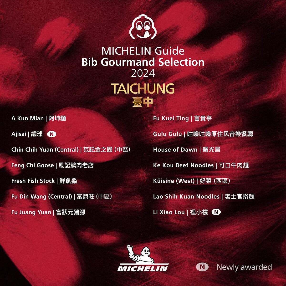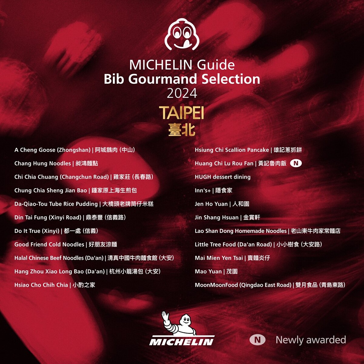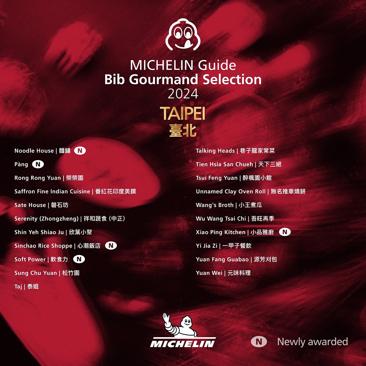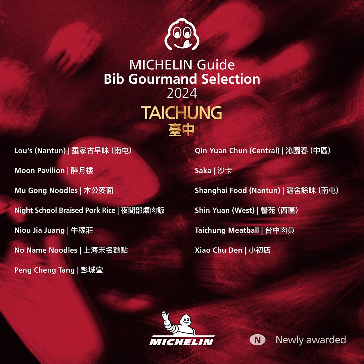 今年台北有6家新餐廳首次入選,分別是知名台菜餐廳「心潮飯店」、超人氣巷內小吃「黃記魯肉飯」、墨西哥料理「Pàng」、台式早餐「軟食力」、在地人最愛的「麵鋪」、宵夜控必朝聖的「小品雅廚」;台中則有以家常菜和小菜聞名的「裡小樓」、江浙和川菜「繡球」2家餐廳首次入選。