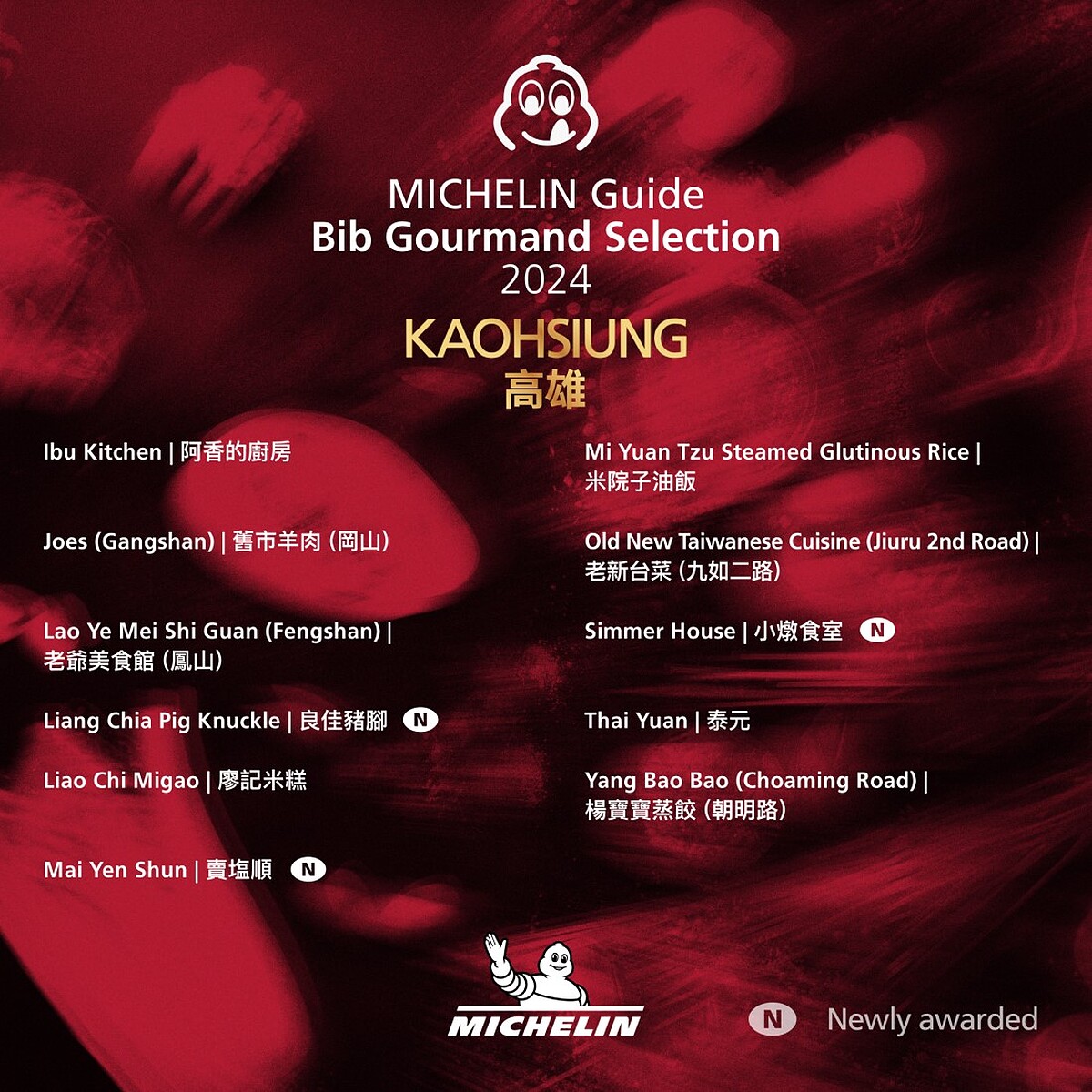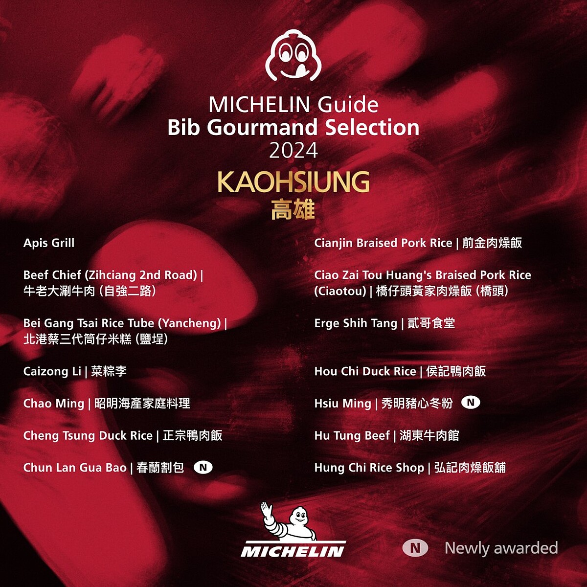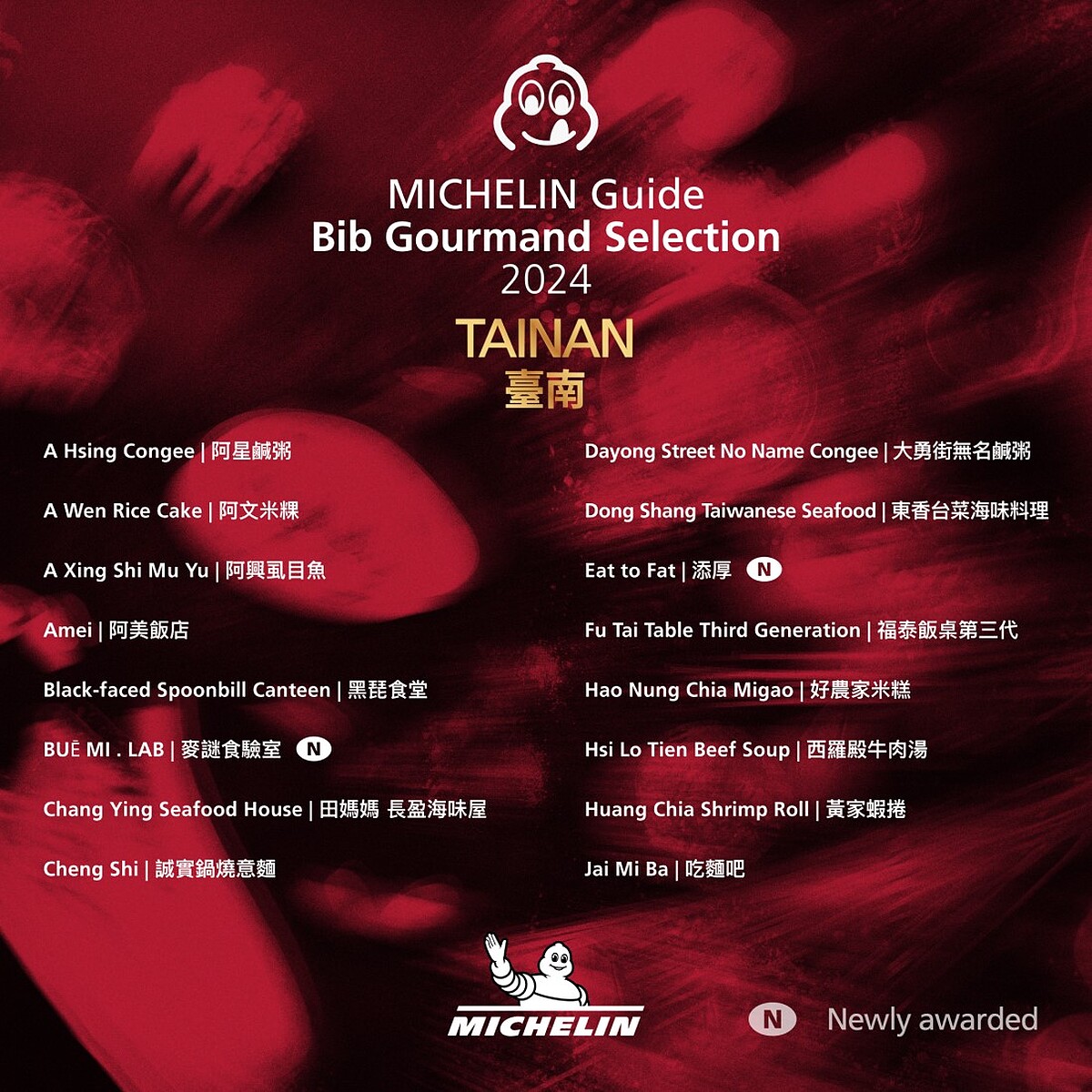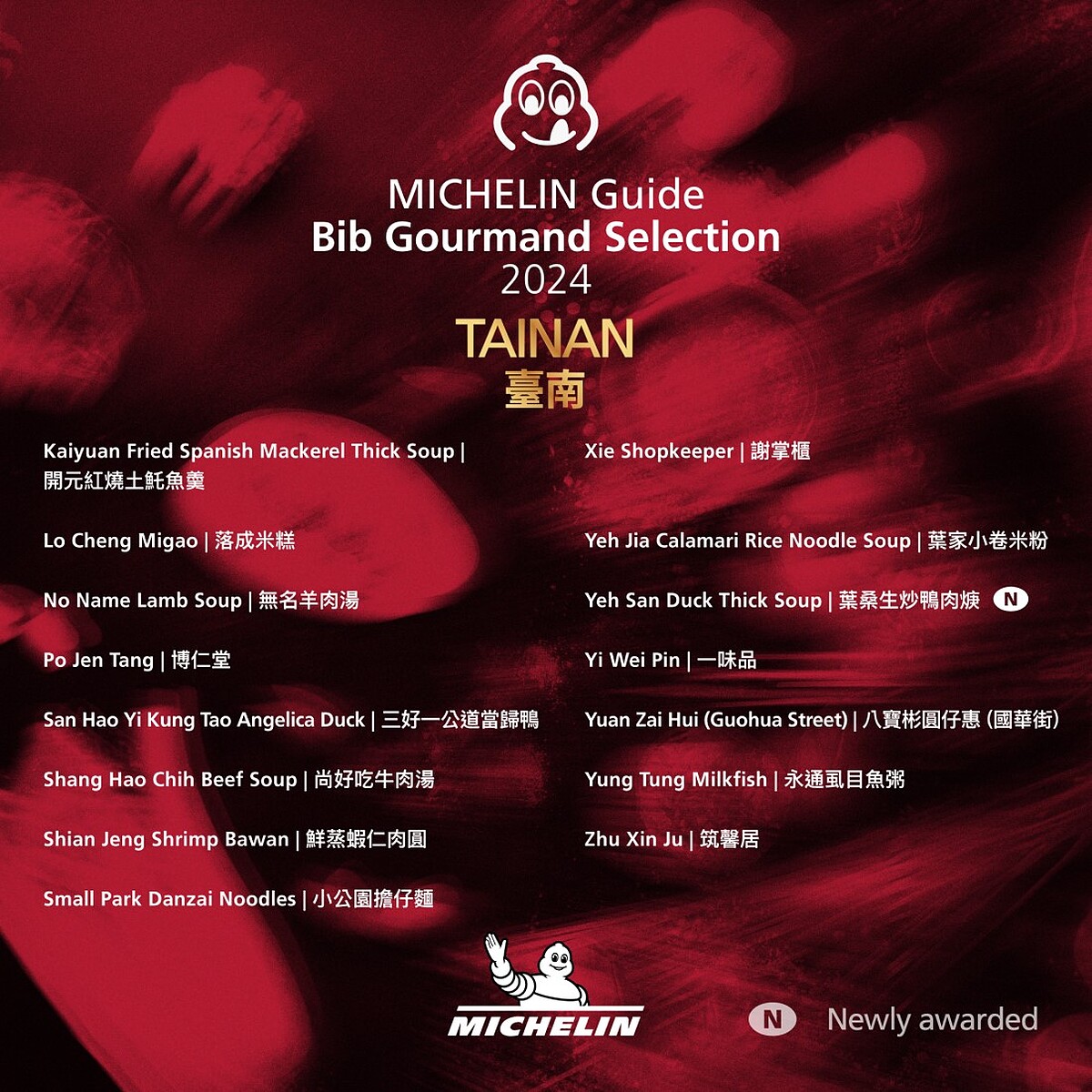 來自台南的創意料理「麥謎食驗室」、精緻台菜「添厚」、新港鴨肉羹「葉桑生炒鴨肉焿」,以及高雄的台菜「賣塩順」、人氣小吃「春蘭割包」、排隊名店「秀明豬心冬粉」、在地饕客最愛的「良佳豬腳」、帶有日式風格的「小燉食室」共10間餐廳,今年首度打進必比登推薦名單。