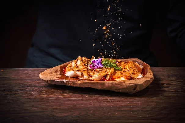 將台灣土雞腿以舒肥方式烹煮,肉質鮮嫩多汁,再淋上品牌自製的椒麻醬汁,香麻帶勁,不吃辣的人要小心被辣到喔~