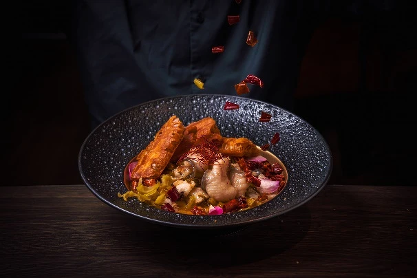 時下超夯的酸菜魚這裡也能吃得到,選用四川傳統老罈酸菜酸香濃郁,特色是使用空運來台的黑鯉魚片,加入台灣在地豆花,讓湯汁除了酸辣味外,更增添一絲濃醇豆香。