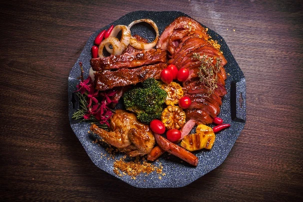 喜歡大口吃肉的凹豆咖看過來~在炙熱的麥飯石岩板上能看到肋排、去骨豬腳、德式香腸、烤春雞以及當季時蔬,肉質多汁軟嫩,還有3種燒烤醬料可以搭配,豬腳建議和酸甜的鳳梨一起享用喔!