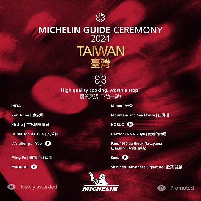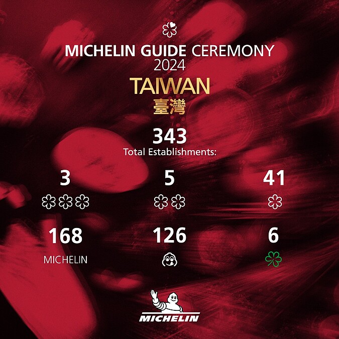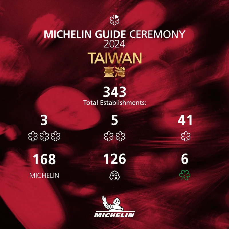 《臺灣米其林指南2024》包括星級餐廳、必比登推介以及米其林指南入選美食餐廳共有343家餐廳和店家,包括台北157家、台中66家、台南59家以及高雄61家,其中一、二、三星餐廳共有49家,10家餐廳首度獲得一星肯定,其中來自台中的MINIMAL更是全球首間受到米其林一星肯定的冰淇淋店!