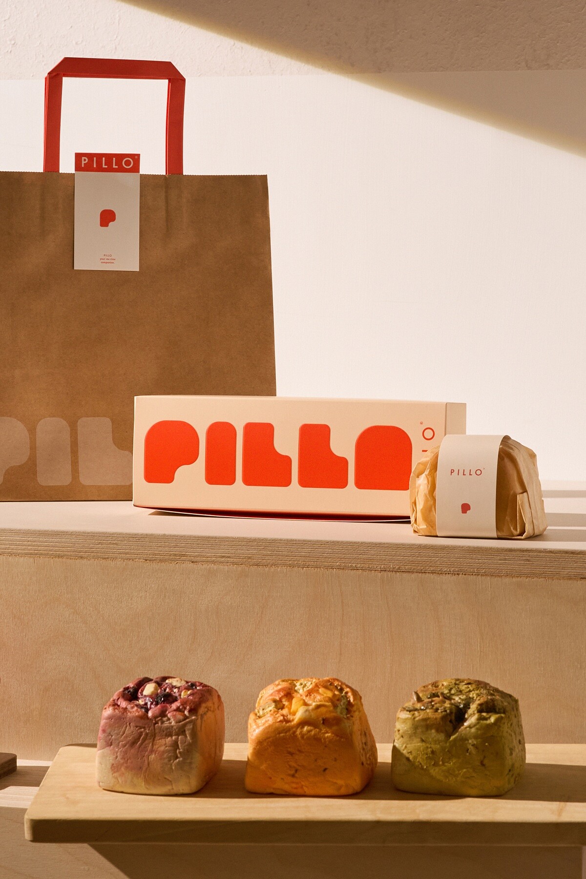 2023年底,與花藝家「Miki Wei Studio」聯名的話題吐司「PILLO」上市,因為體型小巧可愛一個人就能完食,加上獨特的包裝,引起了不少關注。原來「PILLO」品牌靈感來自柔軟的枕頭(pillow),由 Pei 和 Betty 兩兄妹在2023年夏天創立,從小家庭日常飲食為起點,研發方便加熱食用的新型態吐司,因此使用飽和帶有溫暖調性的橘色,枕頭意象打造品牌logo。兩人出身於食品世家,對食物製程有所講究且深植心中,即使 Pei 後來在影像設計領域發展,Betty 在食品產業工作,他們對飲食的熱情依然未變,因而研發出以獨家技術打造Q彈如枕頭的口感的「溫熟成吐司」。