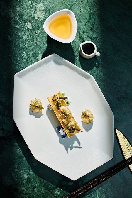 此為總主廚楊光宗的經典拿手菜,要以不帶雜味野生星斑作為原料,而帶空氣感的浮水魚丸每次製程都須經過微調,需要有豐富的經驗才能掌握食材口感,因為每條魚體型、季節、含水量不同,比例就要隨之調整。 魚丸製程要先細網過篩,才能有細緻的質地,接著得下鹽後打至出筋,讓魚丸孔隙小、入口輕柔絲滑,若有似無。並以「老鴨湯」為湯底,使用鴨、雞、瘦肉、蔬果熬煮而成,才能烘托白嫩魚丸、花膠,碗中的白刺蝦則以花椒調味,絕妙的風味展現其不凡的功力。