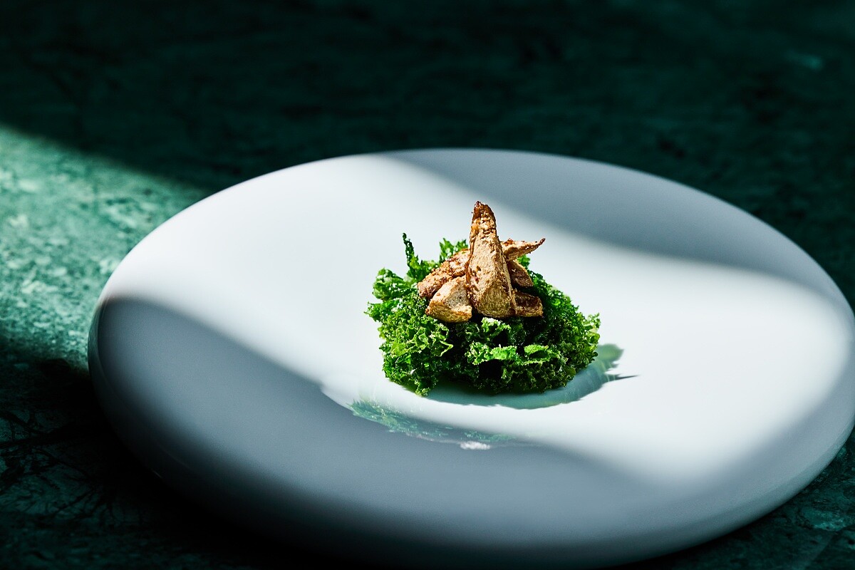 以夏季盛產的綠竹筍為主角,展現其肉質細緻清甜的特色,主廚曲前30%最細嫩的筍尖入菜,要帶殼以米湯慢煮剝殼。接著過油、水洗去油白滷,並以蔥薑、花椒粒爆香,水煮撈起再下鍋油炸,使筍香味濃縮。搭配羽衣甘藍、山當歸兩款蔬菜,加上特製椒鹽增添風味。
