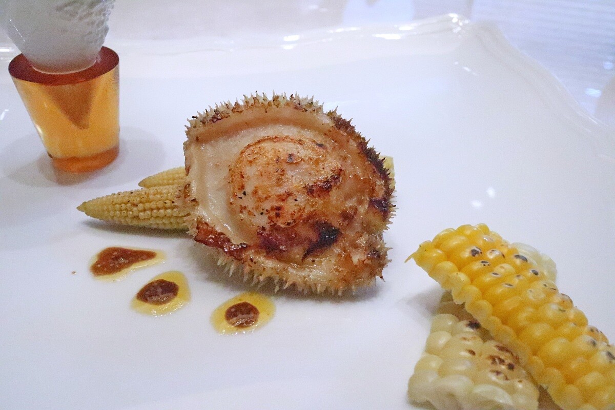 以鮑魚的清鮮「轉換」味覺,帶來清鮮輕盈放鬆的滋味。取用南非鮑魚以錘打方式使之口感柔軟,並保留下鮑魚的彈牙。左上角則為日本水雲醋,並以烤過的牛奶玉米、甜玉米、第戎芥末、巴薩米克醋襯托鮑魚的鮮美。