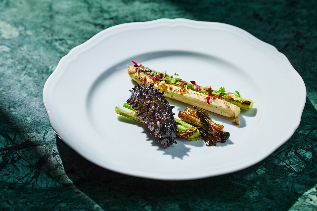 此道料理完美展現江浙菜烹調用語「㸆」的手法,要先利用純度達 80% 的泉水反覆水發,再與蔥燒醬汁的甜香,再以「㸆」小火慢慢收汁完成。首先要以蔥煸過後與高湯熬煮,並另取新蔥煸出香氣,再與紹興酒、醬油及帶蔥高湯以小火㸆之。燒蔥單獨與醬汁拌炒,保留口感乾爽,避免久燒濕黏軟塌,為蔥之上味。如此一來,參有蔥味,蔥有參味,刺參外軟滑、內彈牙,醬汁濃香下飯。