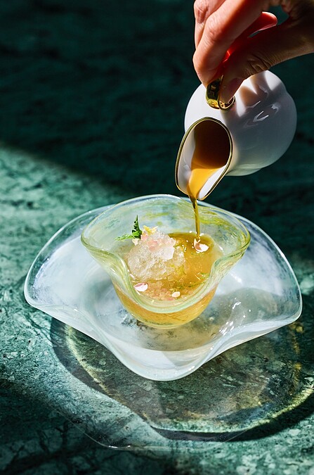 甜品訴說了總主廚楊光宗的童年記憶,位屏東恆春頂虎頭山的家鄉,那裡有他們村莊唯一的雜貨鋪,夏天時,母親會在店裡兼營冰舖,而愛玉冰就是其中最受歡迎的品項。楊媽媽對糖水的香氣和比例有嚴格的要求,這也是冰舖生意興隆的秘訣。楊光宗從小便在母親身邊學習,遵循她的五十年配方,用傳統的方法煮糖,每天親手洗愛玉,重現那來自村莊的純粹老糖味。 要以蔗糖翻炒出天然的香氣,加入白糖提升甜度,並經過精確的熬煮,掌握火候,並使用了黃檸檬、青檸檬以及飽滿果肉的手指檸檬,提升了愛玉的清爽口感。
