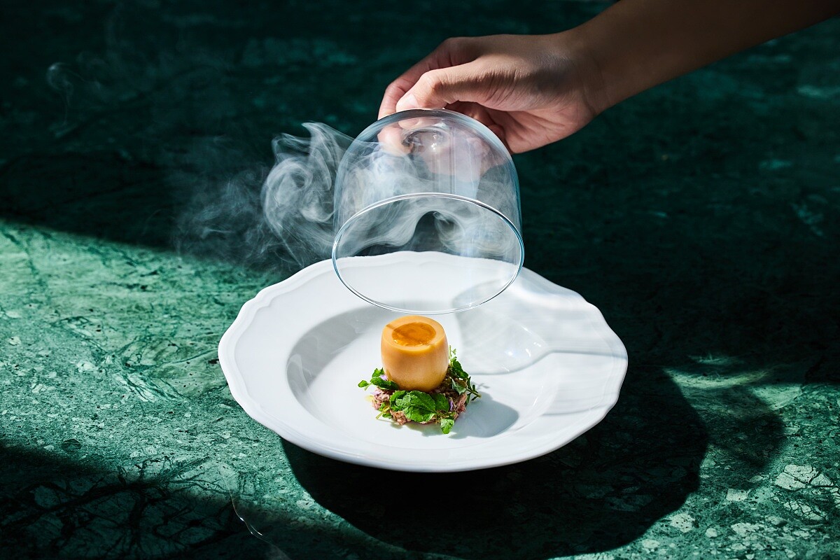 靈感源自「溏心蛋」,鴨蛋則來自屏東四重溪,先以紅玉茶葉煙燻,尾韻有著淡淡的茶香。底層結合牛肉塔塔作法,選用澳洲M9和牛製成,並加入剝皮辣椒、酸豇豆等等中式佐料調味,也消減了其中的芥末香氣,呈現多元的風味。