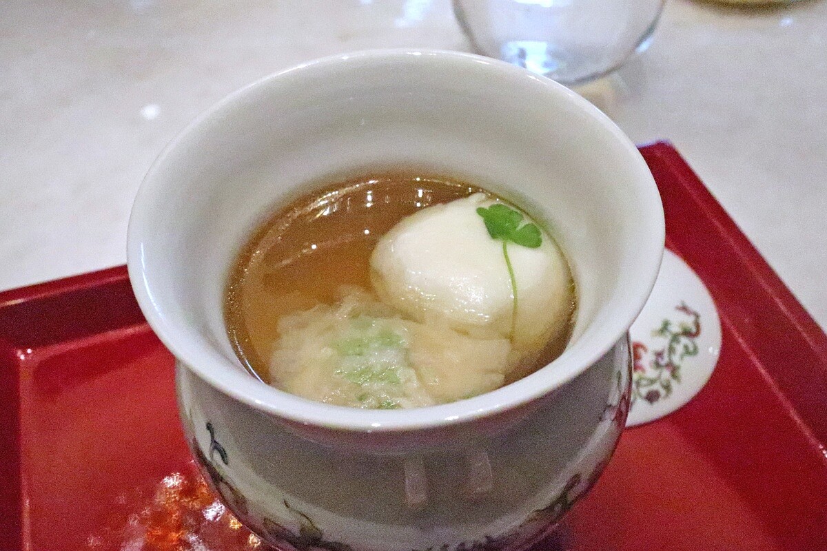 此為總主廚楊光宗的經典拿手菜,要以不帶雜味野生星斑作為原料,而帶空氣感的浮水魚丸每次製程都須經過微調,需要有豐富的經驗才能掌握食材口感,因為每條魚體型、季節、含水量不同,比例就要隨之調整。 魚丸製程要先細網過篩,才能有細緻的質地,接著得下鹽後打至出筋,讓魚丸孔隙小、入口輕柔絲滑,若有似無。並以「老鴨湯」為湯底,使用鴨、雞、瘦肉、蔬果熬煮而成,才能烘托白嫩魚丸、花膠,碗中的白刺蝦則以花椒調味,絕妙的風味展現其不凡的功力。