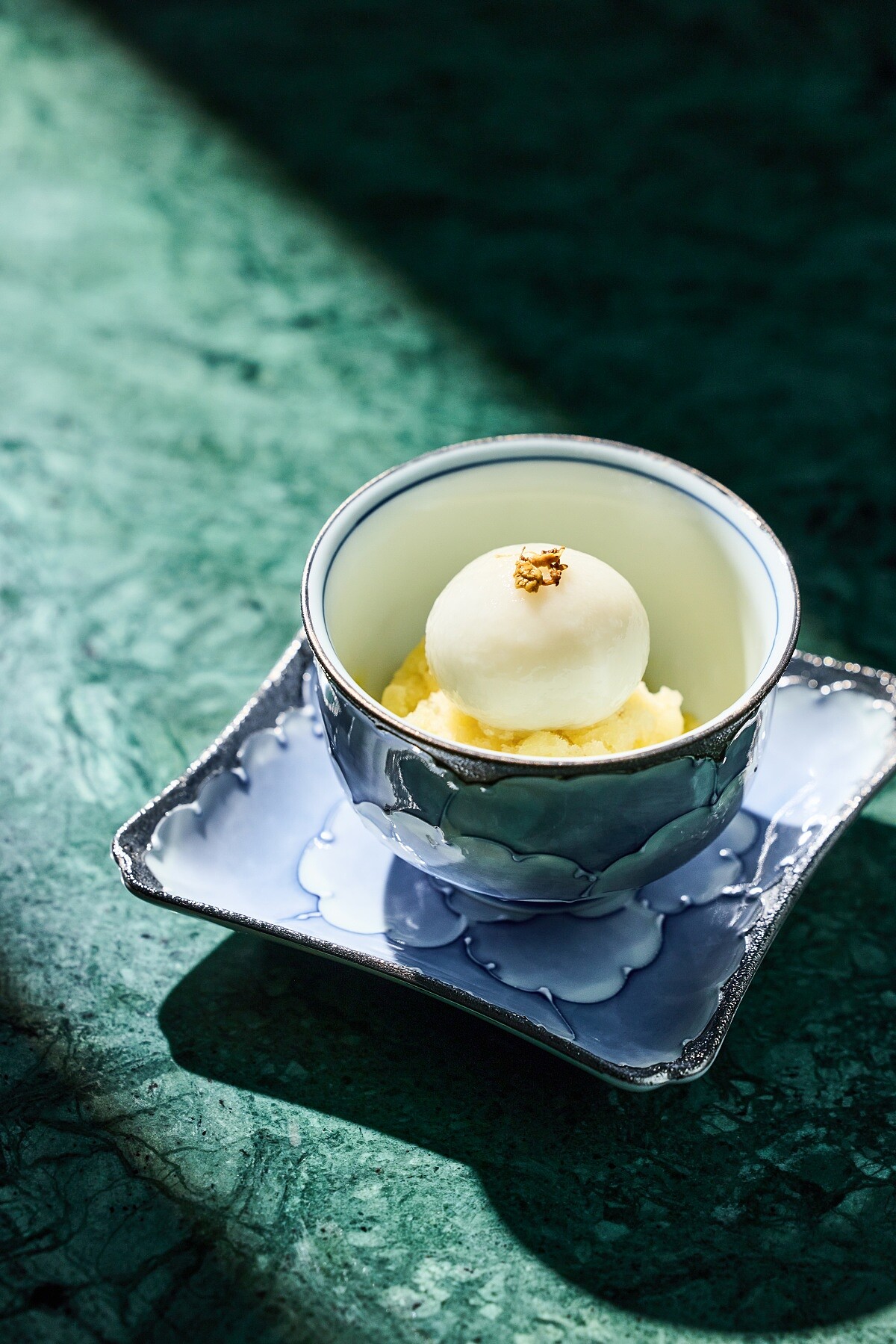 甜品訴說了總主廚楊光宗的童年記憶,位屏東恆春頂虎頭山的家鄉,那裡有他們村莊唯一的雜貨鋪,夏天時,母親會在店裡兼營冰舖,而愛玉冰就是其中最受歡迎的品項。楊媽媽對糖水的香氣和比例有嚴格的要求,這也是冰舖生意興隆的秘訣。楊光宗從小便在母親身邊學習,遵循她的五十年配方,用傳統的方法煮糖,每天親手洗愛玉,重現那來自村莊的純粹老糖味。 要以蔗糖翻炒出天然的香氣,加入白糖提升甜度,並經過精確的熬煮,掌握火候,並使用了黃檸檬、青檸檬以及飽滿果肉的手指檸檬,提升了愛玉的清爽口感。