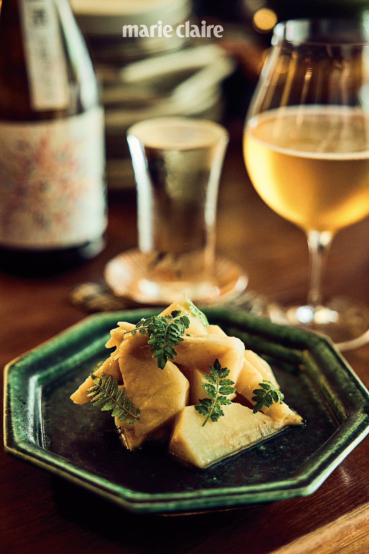 食材:綠竹筍1支、山椒葉少許 調味料:田舍味噌1大匙、梅子半顆、清酒1大匙、味醂2大匙、白芝麻油1小匙