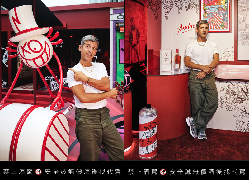 為了展現André Saraiva與格蘭菲迪完美跨界合作的藝術風采,於信義區閃耀揭幕的「格蘭菲迪31年波爾多紅酒桶 聯名限定快閃店」,更讓特別遠道而來的André Saraiva,親眼看見自己歷年的Mr. A作品從2D立體具象化成為3D!他親手繪製的「格蘭菲迪31年波爾多紅酒桶單一麥芽威士忌」禮盒法式彩繪風包裝元素,變身為搶眼的戶外大型裝置,讓這個猶如法式高雅沙龍,融入街頭時尚元素的時尚快閃店,瞬間成為台北市中心的藝術新亮點!