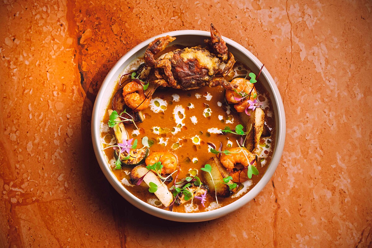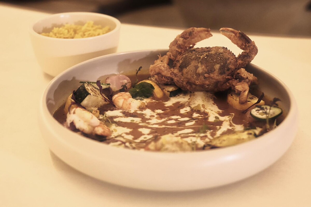 海鮮控看過來~使用椰奶、薑黃油、龍蒿油、辣油、檸檬香茅油、斑斕葉等多種南洋香料,搭配洋蔥、紅蘿蔔一同與咖哩熬煮,再以鋪上櫛瓜搭配整隻金黃的酥炸軟殼蟹與剝好的白蝦,滿滿的椰奶和薑黃香米每一口都是幸福。