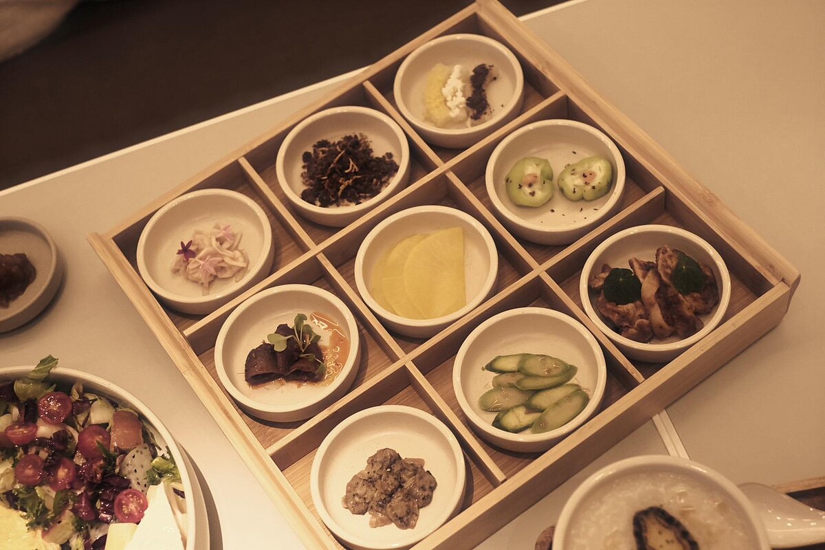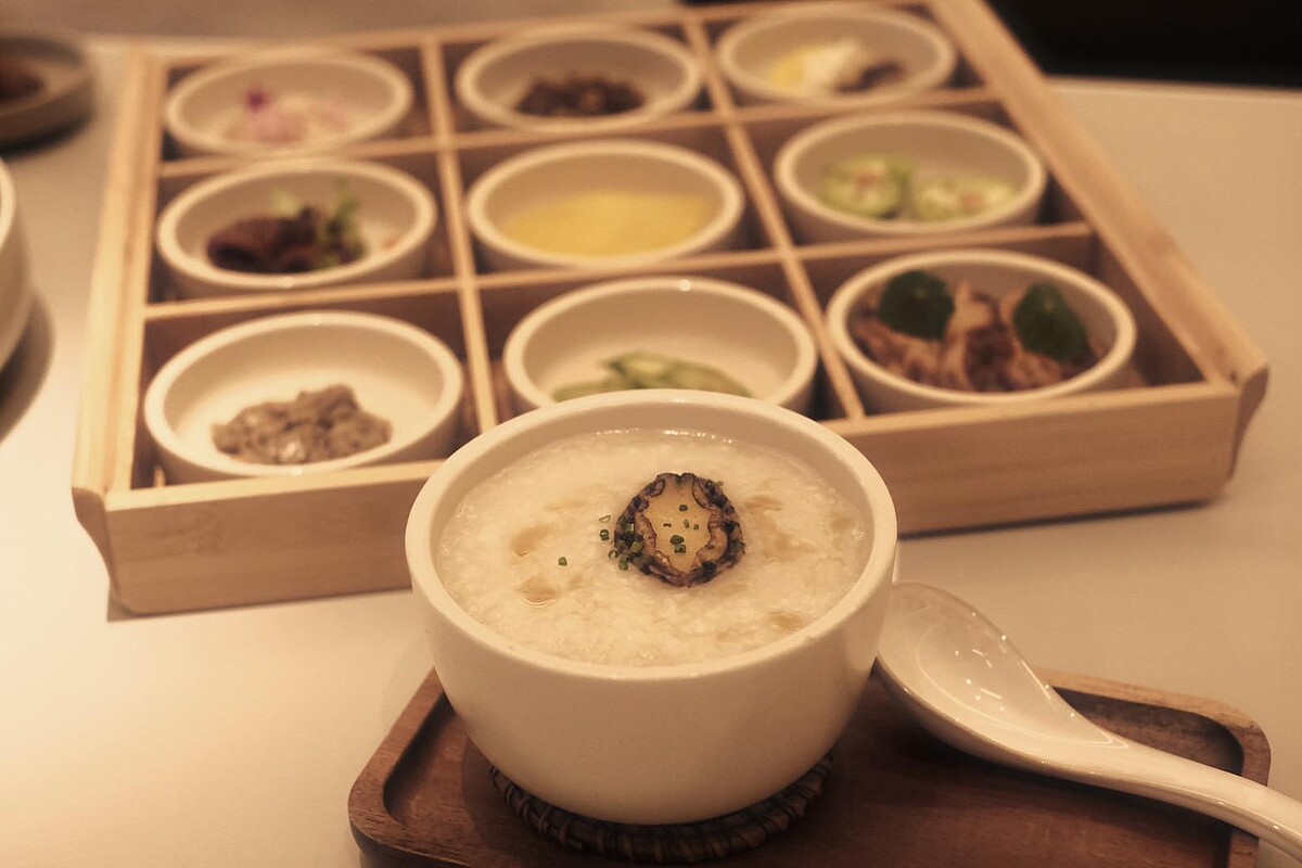 清粥小菜也可以很精緻!以九宮格呈現九道特製小菜方式呈現,每道分別代表著不同風味,有代表酸味的柳松菇、秀珍菇;甜味的塭仔魚海苔肉鬆;苦味的鹹蛋黃豆豉;辣味的辣椒香茅小卷;鹹味的醃蘿蔔;鮮味的角瓜豆腐乳刨香菇;麻感的花椒蛤蠣;香味的青花筍香油;怪味的仿土雞與麻香豆瓣,最後還有鮮味十足的鮑魚粥。