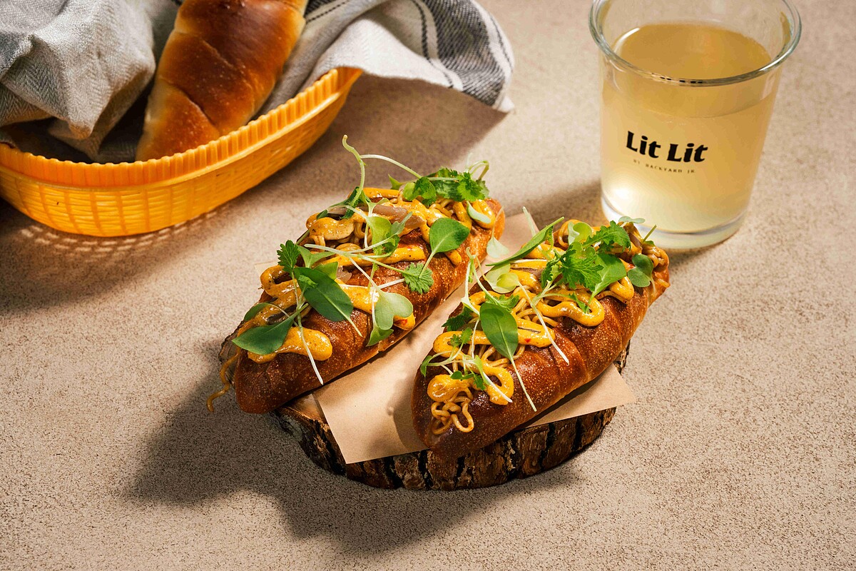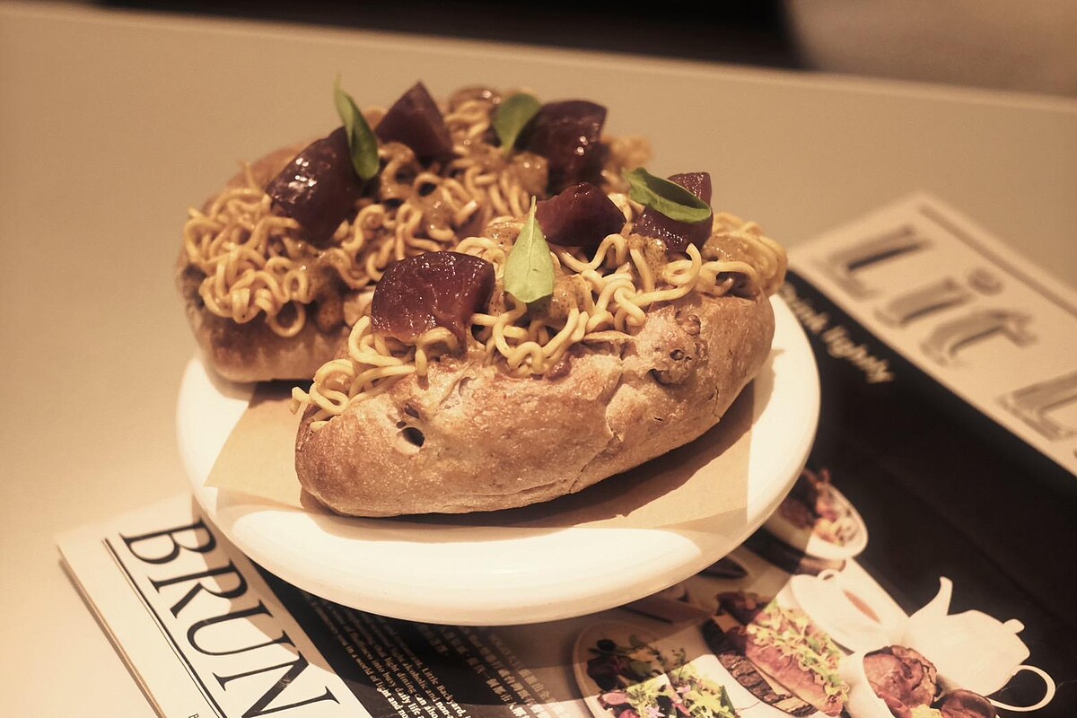 以小後苑最受歡迎的經典菜色「炒泡麵」為靈感,以Q彈有嚼勁的小辣泡麵為基底,搭配醃製蓮霧、辣味烏魚子美乃滋,夾在鬆軟的布里歐麵包中,就是要大口咬下去!