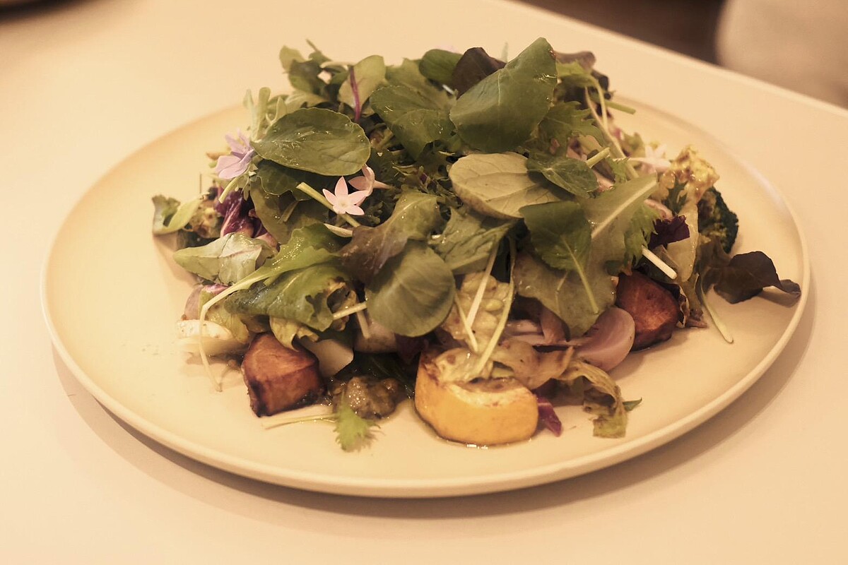 正在忌口的你選擇沙拉就對啦,角瓜、筊白筍、地瓜、小番茄、櫻桃蘿蔔等10幾種當令時蔬,根據喜好搭配土雞/舒肥板腱牛/鴨胸等肉品,再淋上鮮蚵豆豉油醋及青蔥青醬,健康又不失美味。