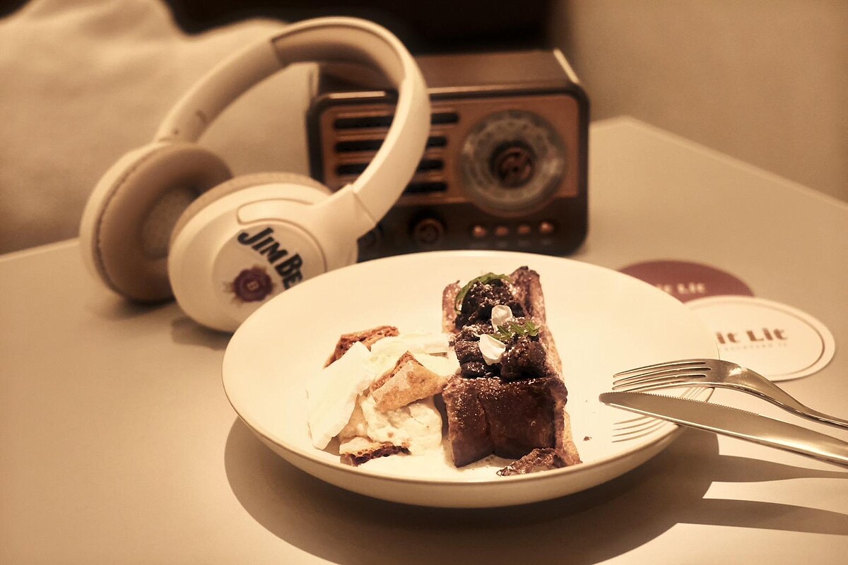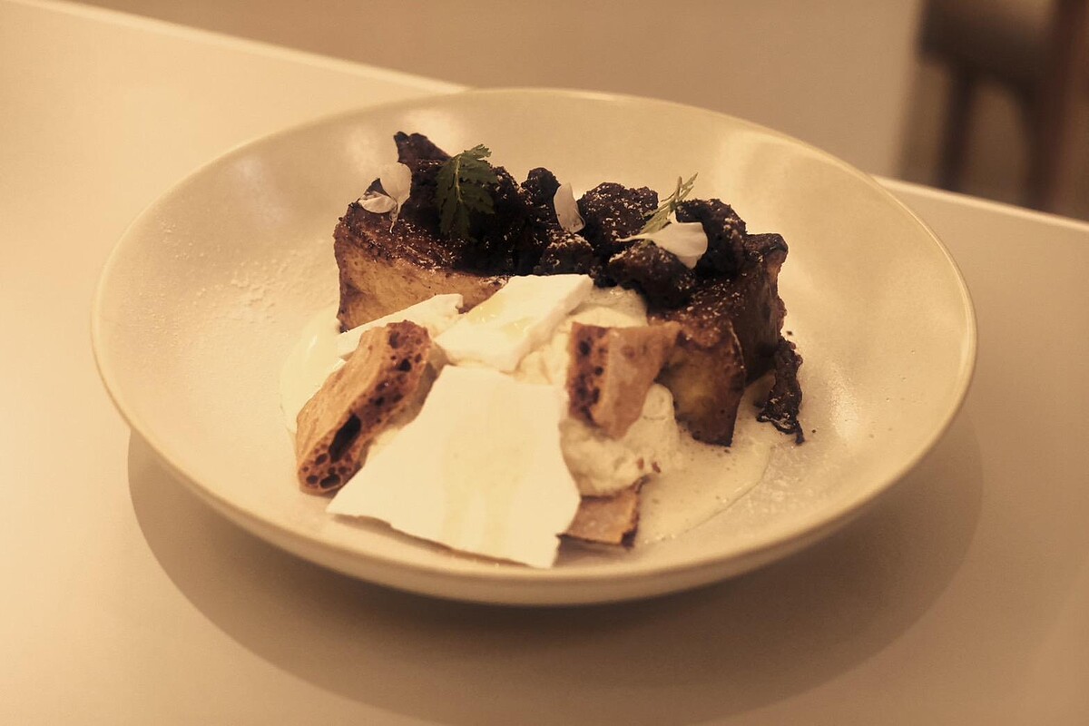 吃再飽都要點的甜點!和一般蜜糖吐司不太一樣,Lit Lit選用的是布里歐麵包,再裹蛋液與鮮奶油後煎至定型,鋪上一層巧克力餅乾,混合蛋白霜與桂花泡沫的慕絲並搭配蜂蜜,最後撒上咖啡粉並以食用花朵。