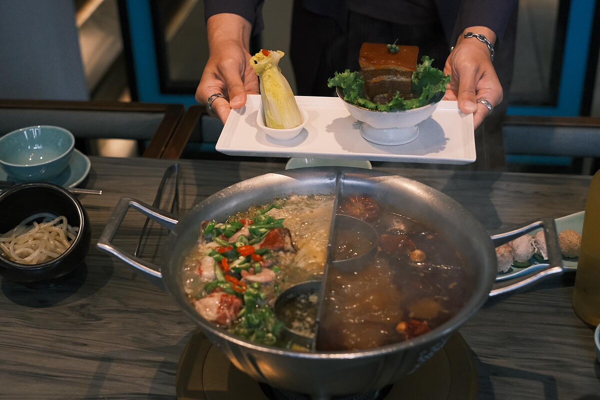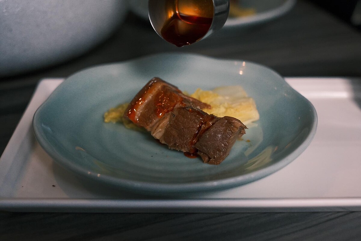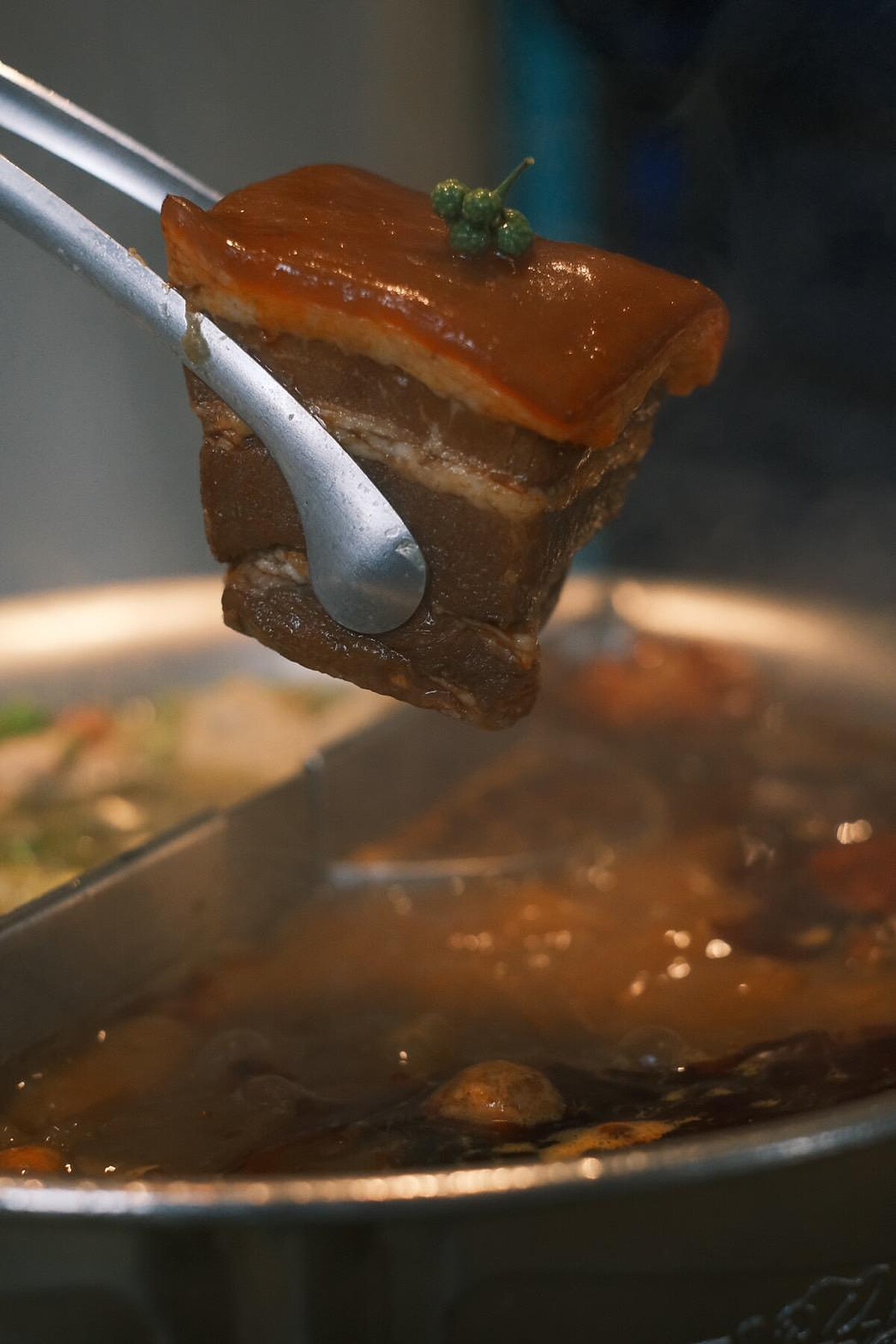 層次分明的豬五花肥而不膩,以冰糖、辣醬、黃酒及獨家配方滷製1.5小時後,再浸泡1小時使表面出現均勻的焦糖色,光看就讓人流口水,上桌的時候還搭配乾冰效果。將豬五花切成適當大小後,放入青花驕紅鍋中燉煮約6分鐘,入口即化的口感真的太誘人。