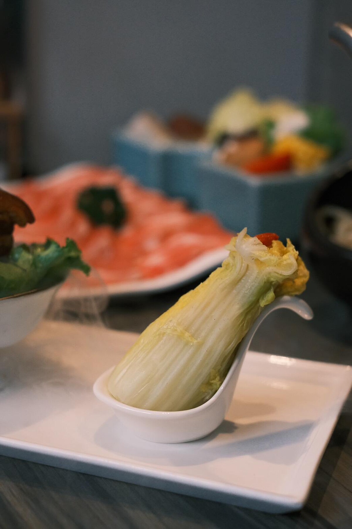 使用白菜入口最脆嫩的部位,小巧精緻的模樣真的就像是藝術品般賞心悅目,完美重現翠玉白菜的細膩。可以選擇搭配青花驕各式湯底入鍋涮煮,讓蔬菜的甘甜與湯底互相襯托,散發濃郁花椒香氣,最後再加上枸杞提味,視覺效果一百分!