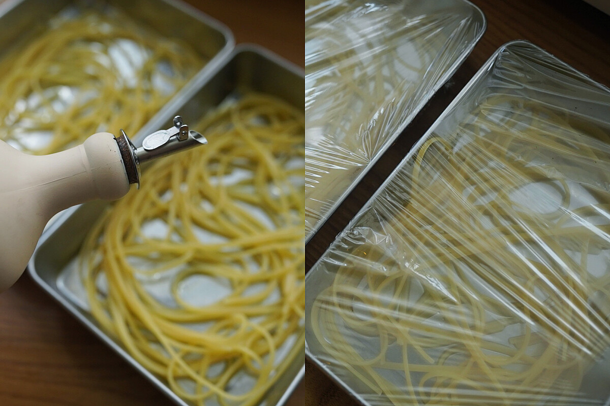 3.準備有點深度的大盤,三分鐘後取出麵條,趁有熱度時淋上橄欖油,並均勻鋪滿在盤子上,蓋上蓋子或是用保鮮膜確實包裹住,悶約四~五分鐘,期間可以確認熟度,並保留下煮麵水。