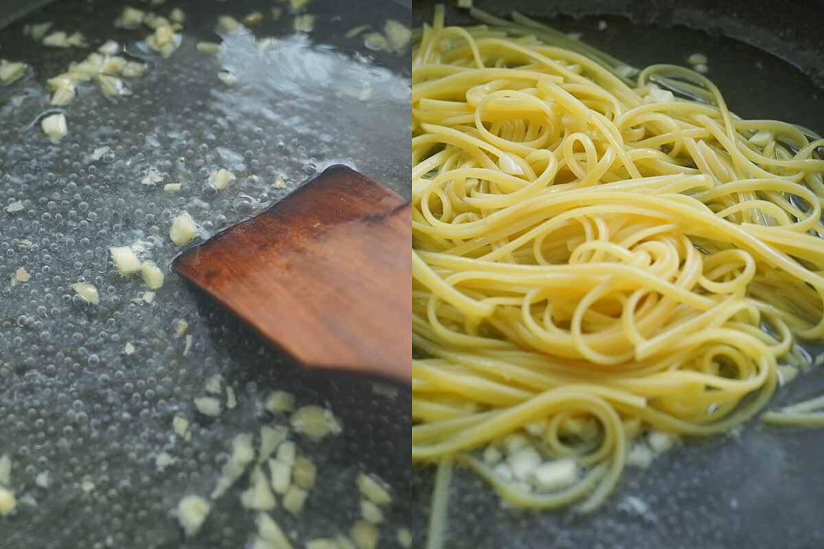 5.加入麵條且不停攪拌(或翻鍋),藉此讓蒜頭慢慢乳化成醬汁,此刻也能同步放進辣椒片與適量胡椒。