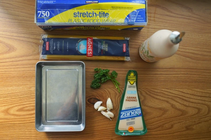 材料:扁麵條(Linguine)100克、蒜頭20克,切片或末、橄欖油,4大匙、帕達諾起司(Padano),適量、乾辣椒片,適量、巴西里,切碎(不是必要)