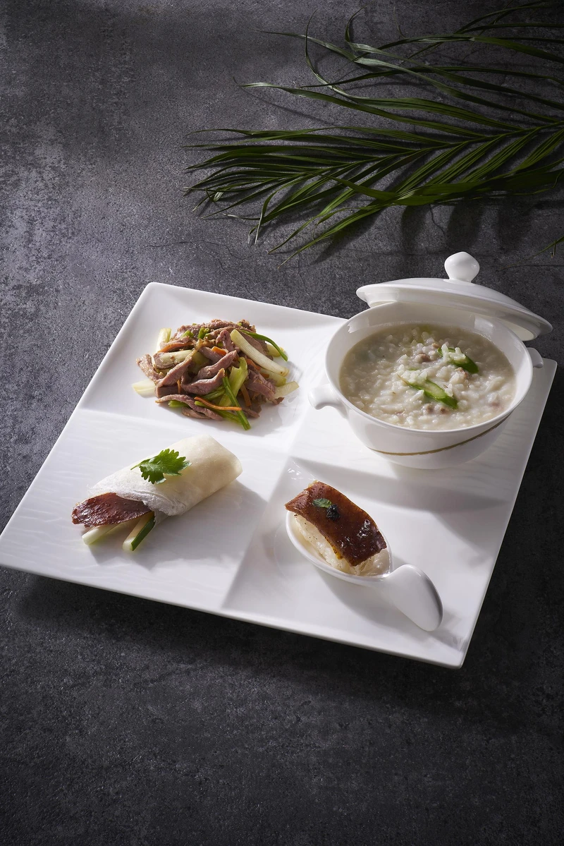 北馥樓特聘專職的燒臘師傅每日限量推出「桂花片皮烤鴨」,可以搭配特調桂花冰梅沾醬享用,鴨肉可另做金華火腿濃湯煨鴨粥、XO醬韭黃炒鴨絲、炙燒鴨皮壽司等多種吃法,需要三日前先預約喔!