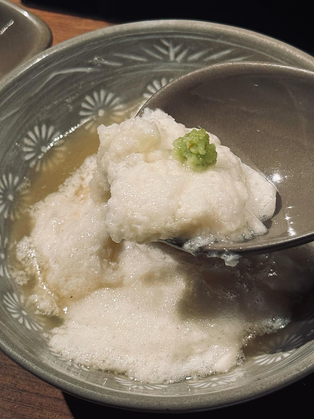 另一種吃法則是淋在冰鎮後的「信州蕎麥麵」上,滑順滋味和麵體巧妙結合,將大和芋的絲滑口感加乘,或是將汆燙後的日本和牛、西班牙Bellota伊比利豬包在一起品嚐也別有風味。