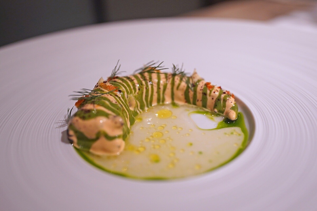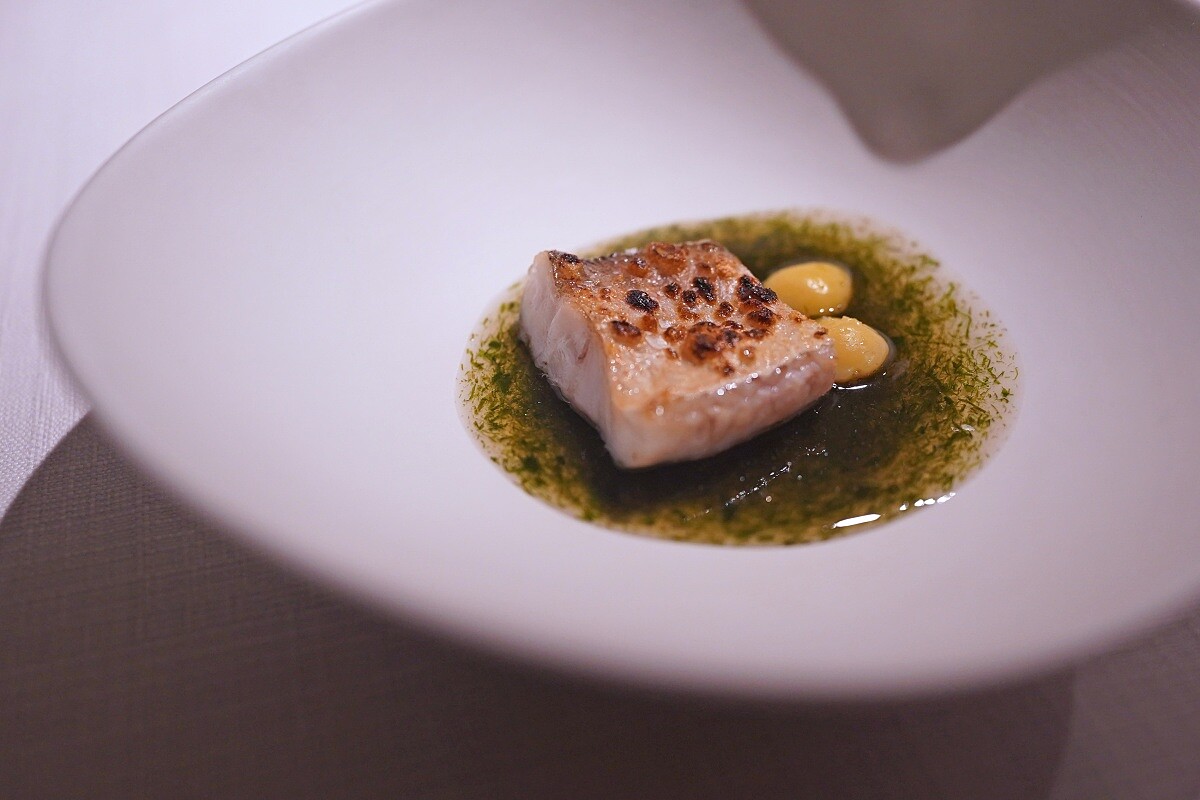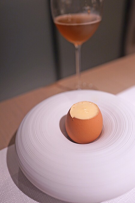 「晚夏菜單」以裝載在蛋殼中的北海道赤海膽作為開場,依序鋪上來自彰化埔鹽的白花椰菜泥,並以手指檸檬提味,上層則為來自台南永順興牧場雞蛋製成沙巴庸,從底部挖取食用,能感受到三種食材分別不同的質地與風味,同時也讓濃郁的海膽成為柔和的樣貌,也更加期待接下來的菜色。