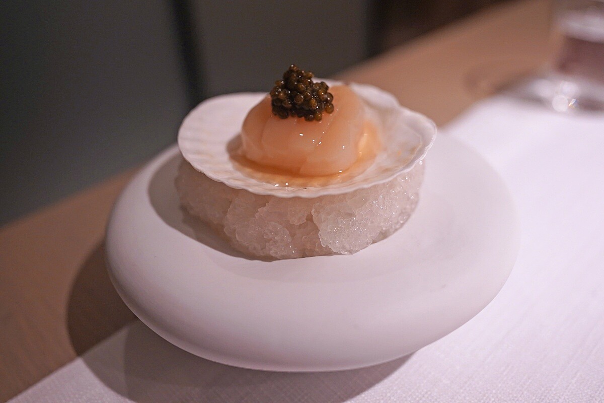 Chef Nobu 經典的「帆立貝」擺盤簡約、風味醇厚,不僅僅只是招牌菜色,也完全闡述了他的料理哲學,這次同樣羅列在菜單上,接著再加以延伸詮釋。 首先上桌的是冷盤,選用來自日本宮城縣的帆立貝,特以昆布鹽水浸泡使其微微脫水,讓質地更加緊實,接著加入煙燻氣息。搭配上帶有堅果、奶油香氣的 Astrea Hybrid Kaluga 鱘魚子醬,並以瑤柱、乾香菇、昆布製成的清湯,也呼應了經典帆立貝的搭配,最後在底層加入豆腐泥。看似簡單的將原食材擺盤,其實隱藏著主廚對細節的極致追求,燻香更襯托了帆立貝鮮甜的滋味。