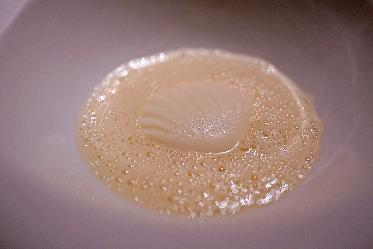 以單一食材帆立貝為中心,選用來自北海道網走市的帆立貝製作成慕斯,鋪襯的則是以奶油、昆布、干貝(瑤柱)和香菇打發而成的醬汁,展現出帆立貝乾淨飽滿的風味,也透過一冷一熱,將食材美好之處展現得淋漓盡致。