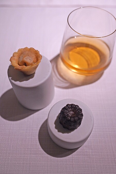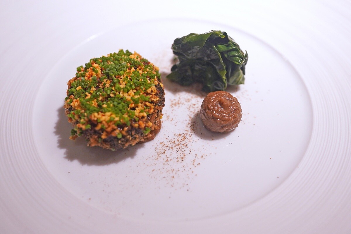 將來自宜蘭產的鮑魚清蒸後裹上薄麵包粉、海苔碎、蛋液後酥炸,醬汁搭配上焦糖、薑、雪莉醋、清酒、番茄熬製的中濃醬汁,最後灑上蛋黃碎、蝦夷蔥和巴斯克辣椒粉,配菜則是帶有山葵辛香的炒菠菜、香菇泥與牛肝蕈粉,透過豐富的風味堆疊,雖然是油炸菜色,卻外層酥脆而不失清爽,鮑魚也呈現軟嫩的口感。