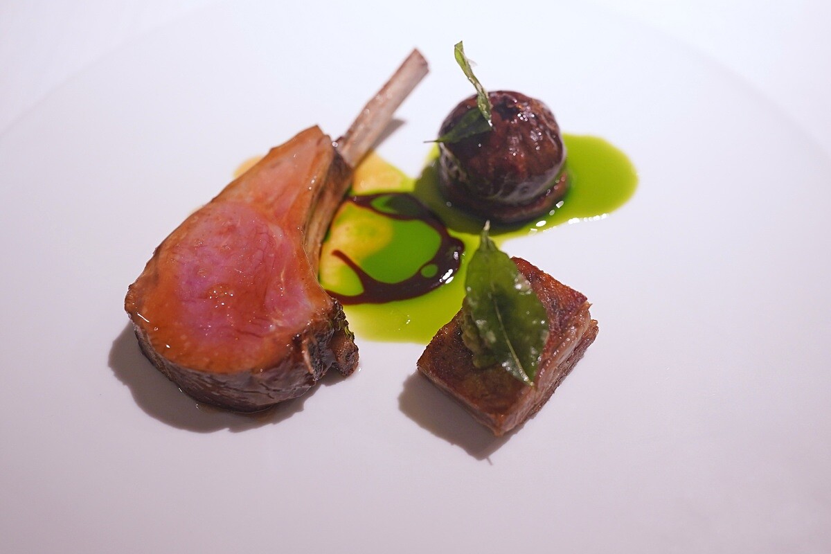 主菜選用來自紐西蘭的頂級 Lumina 羊,主廚特別使用帶骨羊里肌及羊五花兩個部位。羊里肌先浸泡昆布鹽水,再以奶油反覆油淋煎至五分熟,保持肉質的鮮嫩與風味;羊五花則經過清蒸,靜置後再用重物壓整,最後乾煎逼出油脂,呈現香脆的口感,加入綠橄欖和鯷魚碎,增添鹹香風味,搭配酥炸咖哩葉。配菜方面,選用來自桃園大園的無花果搭配,整顆無花果香料糖水熬煮,還有無花果製成的哈里薩辣醬(Harissa)帶來濃郁辛香的餘味,以及無花果葉油、無花果風味的巴薩米克醋。無花果獨特的香氣為豐厚油脂注入一抹清新,平衡了羊肉的鮮味與鹹香。