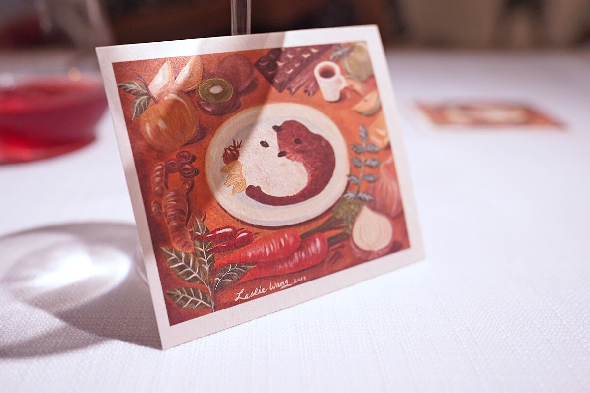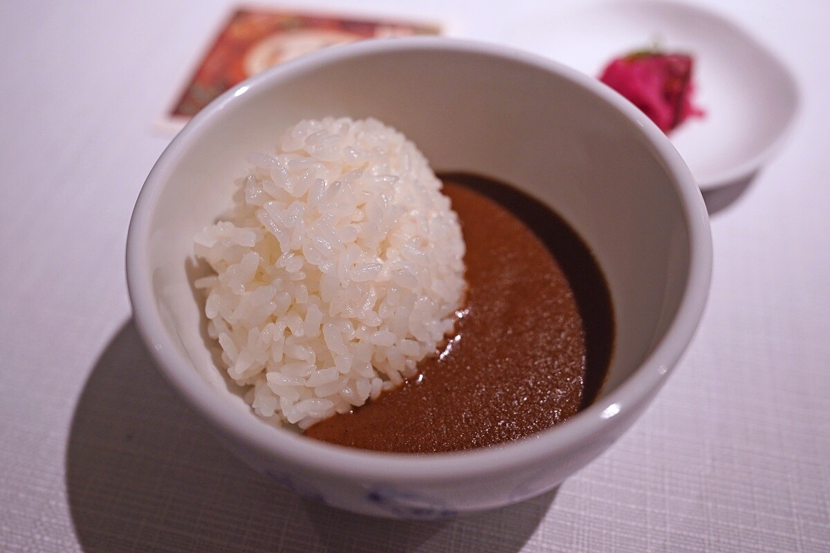 在主菜過後沿襲餐廳的儀式,帶來李氏咖哩。濃郁的日式風味來自已故好友的秘方,以各種食材如蔬菜、蘋果和巧克力熬製而成。一旁有自製的福神漬,台裔美籍藝術家王意馨(Leslie Wang)手繪的卡片,背面的文字表達了這道料理在主廚心中的獨特地位。