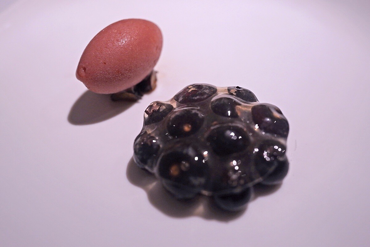 主甜點則以「葡萄」為主角,選用果香豐郁、香甜多汁的巨峰葡萄,製成果泥、慕斯、果凍和冰沙,以不同質地、口感來堆疊葡萄的美妙風味,再襯佐新鮮藍莓和發酵藍莓,酸甜層次迷人悠揚。