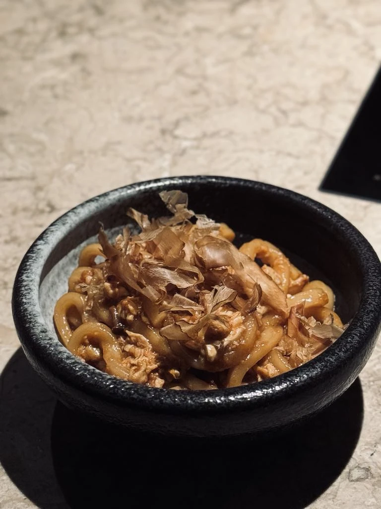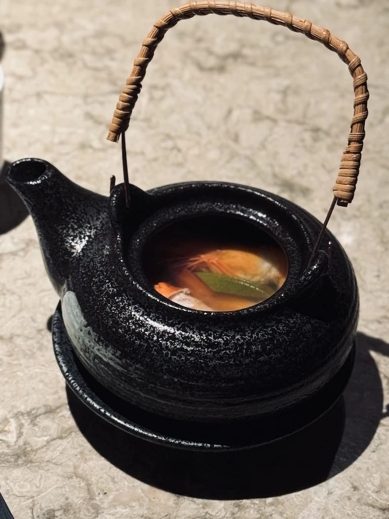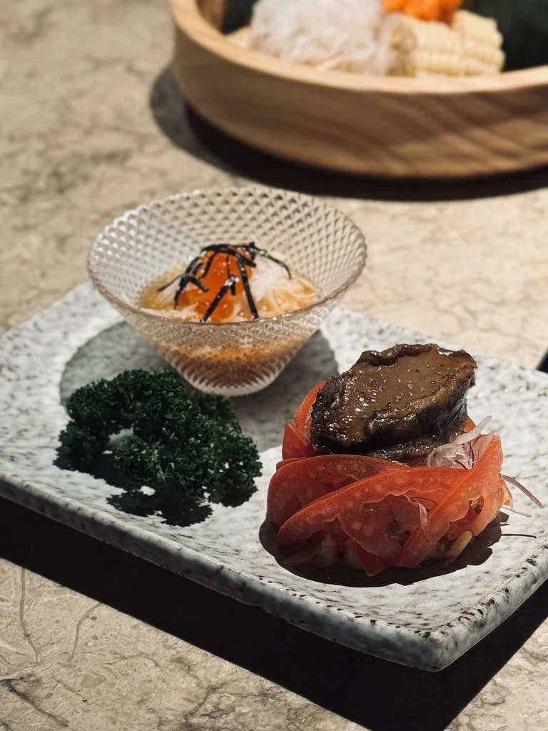 以Fine Dining形式上桌的《FINE;DINING》聯名套餐,亮點菜色選擇日本熊本縣A5和牛肋眼,油花均勻軟嫩適中,無論是單吃或是沾上獨門沾醬都有不同風味,更首次端出日式土瓶蒸料理,使用日本松葉蟹腳、北海道生食級干貝等新鮮食材蒸煮,入口清爽甘甜,是最暖胃的品項。