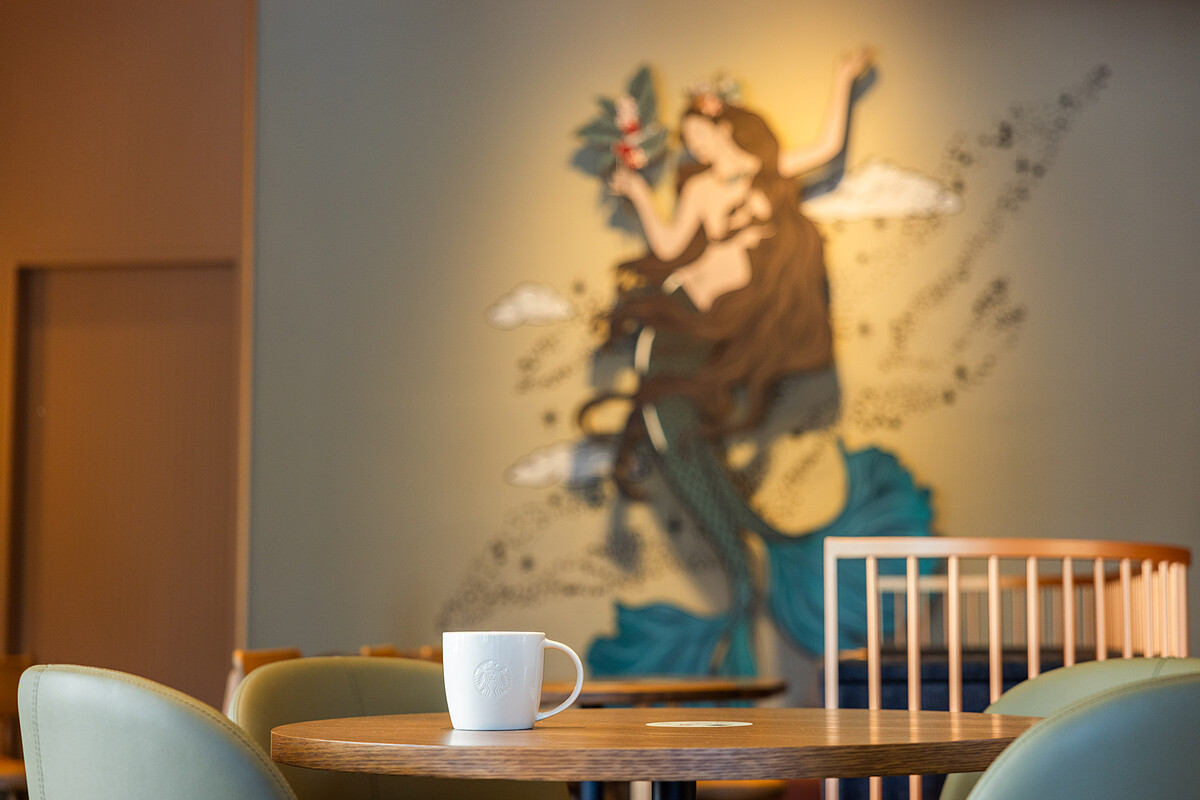 店內以線條簡約俐落的家具和內斂的大理石紋理,搭配整體奢華大氣的美拉德色系,打造出古典與現代的華麗邂逅,可以看到門市藝術牆面上,將Siren女神手持咖啡樹枝果實的優雅姿態翩然呈現。