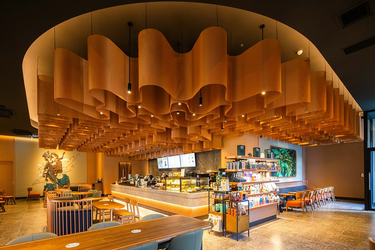 全新的台南星巴克湖美門市降臨ZEELAND-MARK湖美廣場1樓,以璀璨華麗風格為主題,靈感來自於立面優雅的拱門,門市內天花板以層層弧形線條開展延伸,搭配選用奢華大氣的美拉德色系妝點出高貴雋永的美感。