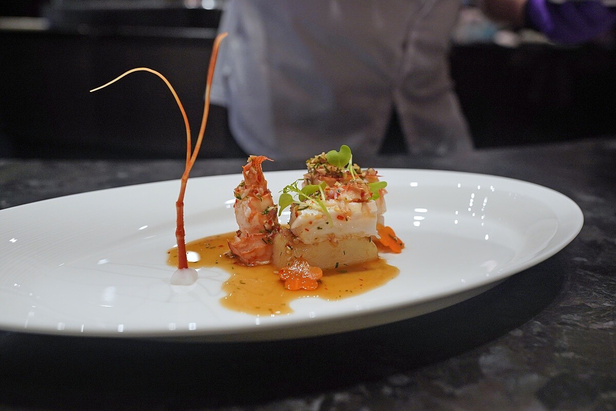 這道菜以「蒸」的手法開場,充分展現了食材的「清鮮爽嫩滑」。主廚選用澳洲活龍蝦,運用猛火快蒸的技法。雖然蒸的方式看似簡單,但其實有許多講究。主廚根據經驗精確掌握火候,將現宰的龍蝦帶殼蒸煮10到12分鐘,火力必須精準控制,目的是要鎖住汁水,讓蝦肉爽彈而不韌,內部恰到好處,透出溏心的質感。最後,將檸檬葉、香茅和雀眼辣椒等香料製成的泰式醬汁淋上,這道熱帶風情的醬汁與山珍海味相互輝映,搭配水梨的清香甘甜,香氣四溢,滋味層次豐富。