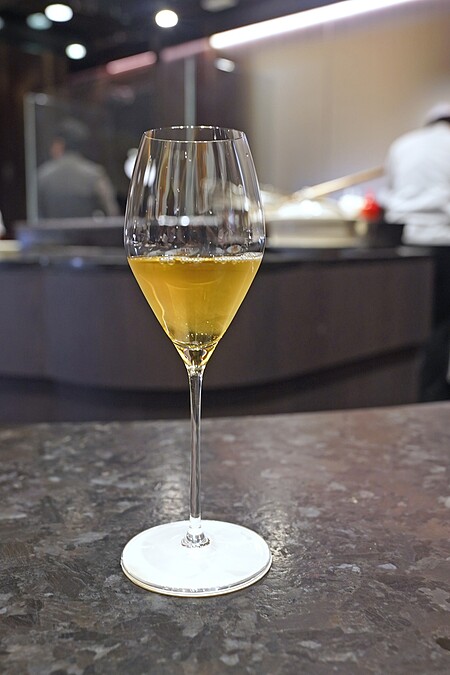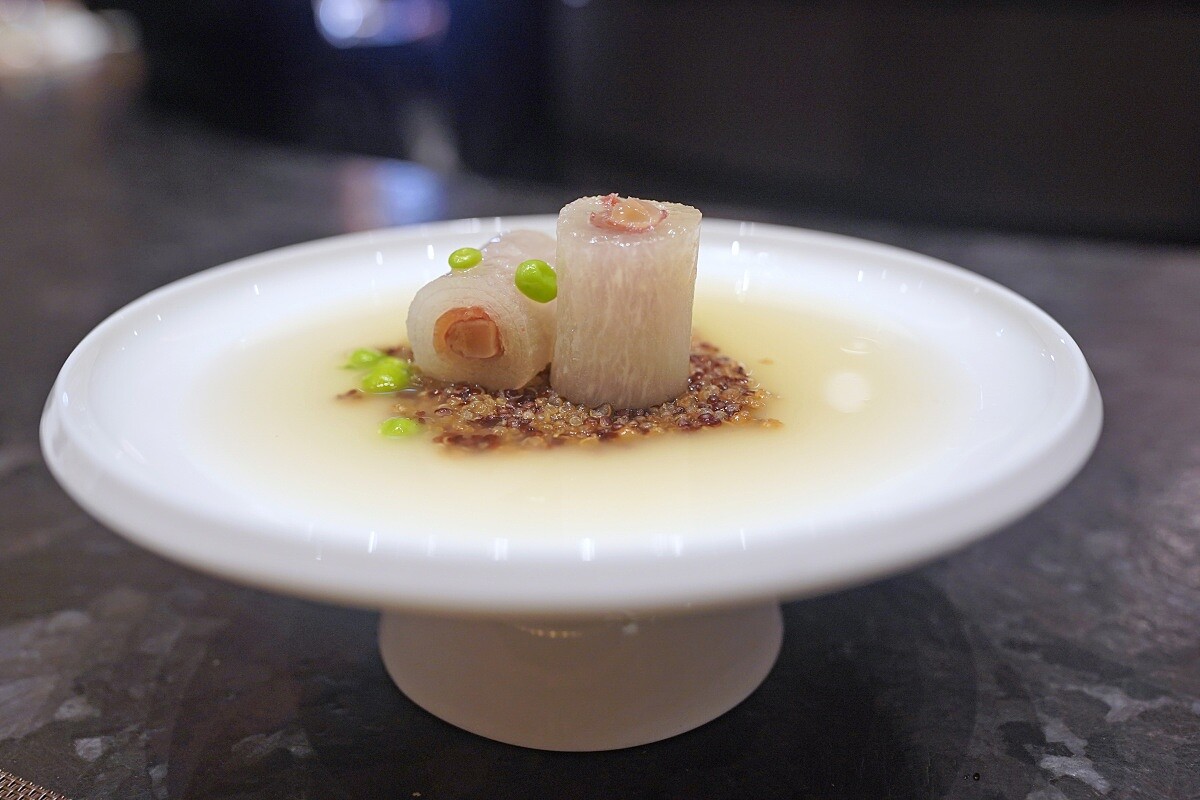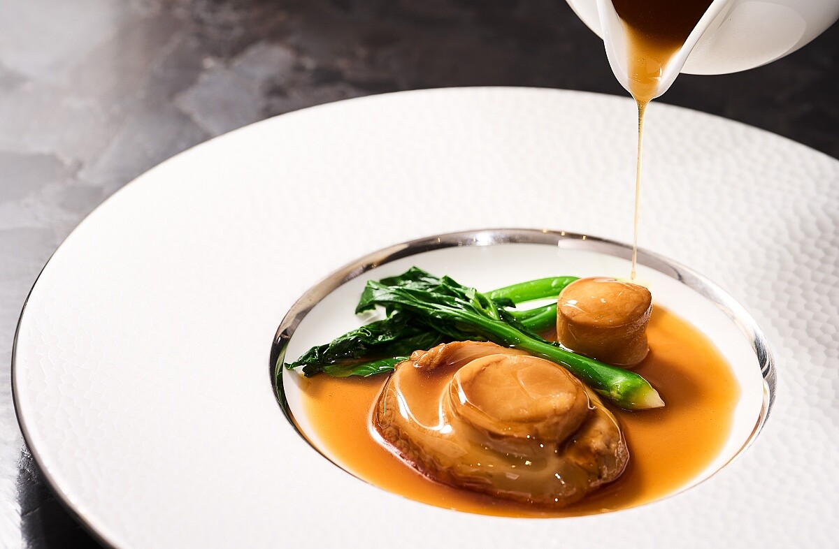 這道料理展現了主廚獨具匠心的一面,為古法菜譜注入了創新思維。為了讓客人體驗到鮑魚的不同吃法,他將鮑魚中心最軟嫩的部分取出,然後填入悉心發泡的北海道頂級瑤柱,接著與老母雞、鳳爪、龍骨等素材熬煮成濃郁的鮑汁,一同煨煮入味。取出的鮑魚芯口感彈牙,令人驚豔,肉質鮮嫩如絹,加上讓人食慾大開的濃郁鮑汁,完美展現了主廚對食材的深刻理解和無限創意。