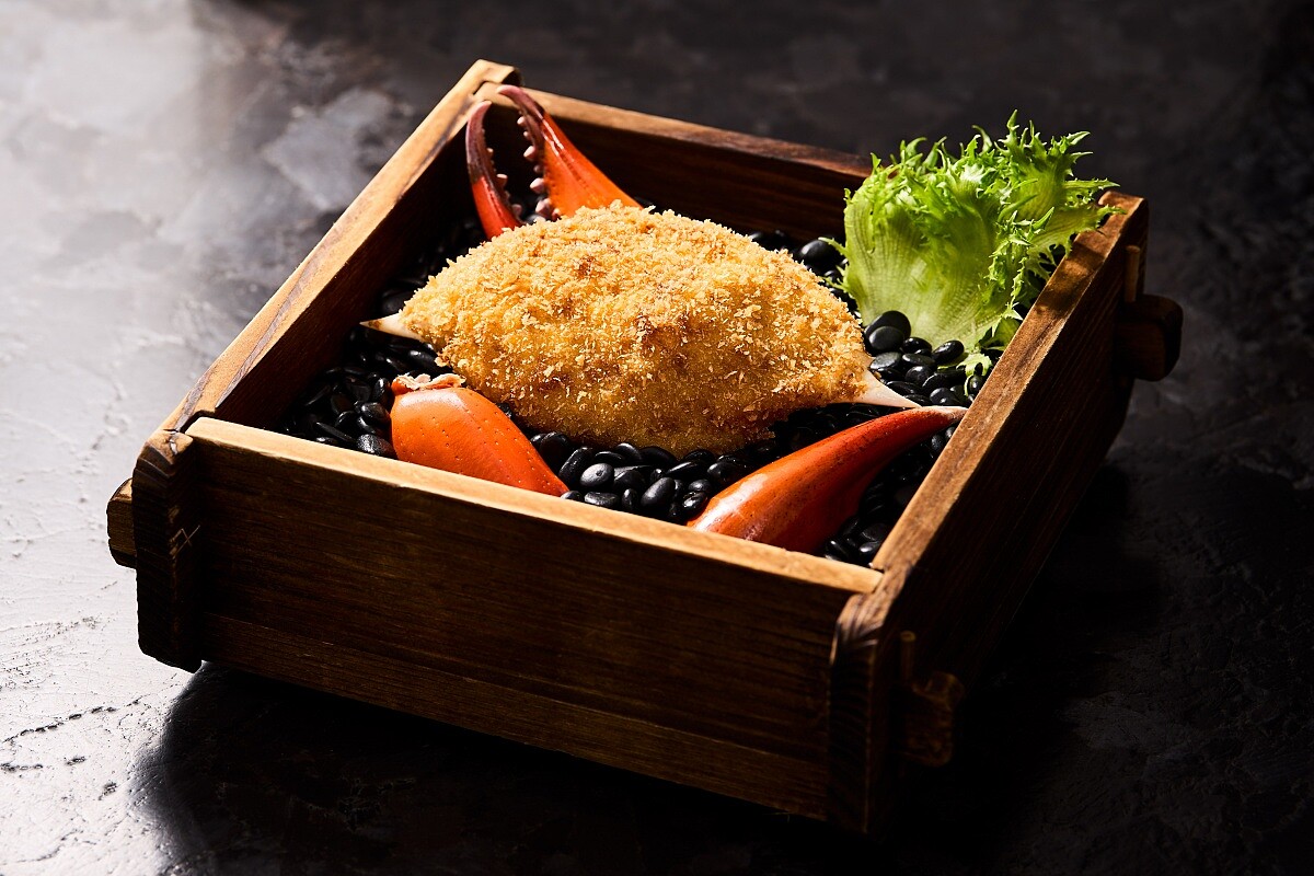 飽滿的蟹餡被回填入蟹蓋,裹以兩層蛋液和麵包粉,炸至內餡熱燙、外皮清爽。主廚在版前的料理檯上完成淋油動作,使滿室生香,蟹蓋入口時,香滑鮮甜的味道令人陶醉,能搭配鎮江醋使用,平衡了奶醬的厚重香氣。料理完美呈現出正統菜品的精細與華貴,讓人回味無窮。
