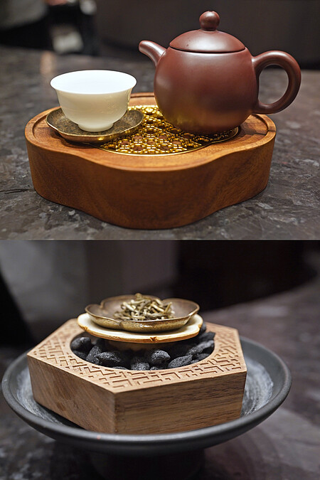 使用冷泡的東方美人茶作為開場,散發著花果香與蜜糖香氣,用來完美襯托首道的海鮮醬熱菜的鮮香風味。