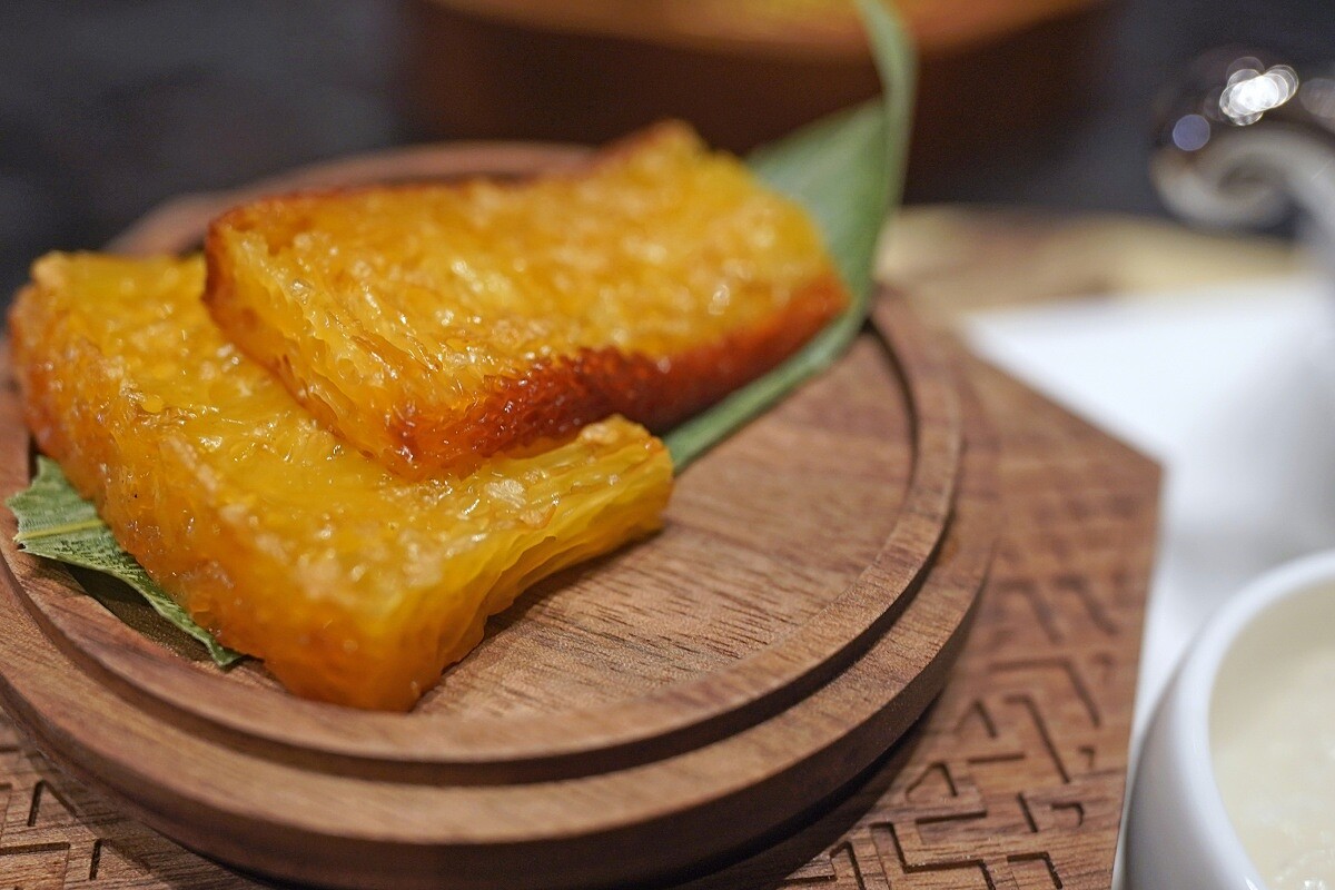 這道菜由港點主廚霍志鵬以古法精製而成,名為黃金魚翅糕。此甜點僅使用糖、雞蛋、椰漿、樹薯粉和酵母等簡單食材,魚翅糕因其外觀呈線絲紋條狀神似魚翅因而得名,其做工繁複,因此是道當今相當難得一見的懷舊甜點。 要先將雞蛋打發並與椰漿、樹薯粉混合,過篩後以平衡的力道進行打發,並在30度的環境中發酵3小時。最後,魚翅糕會送入烤箱烘烤,至表面金黃亮澤。在食用前,廚師會將其切片並進行乾煎,完美呈現華麗的紋理,其口感彈嫩,細膩的結構讓每一口都充滿了香氣,回甘且迷人。