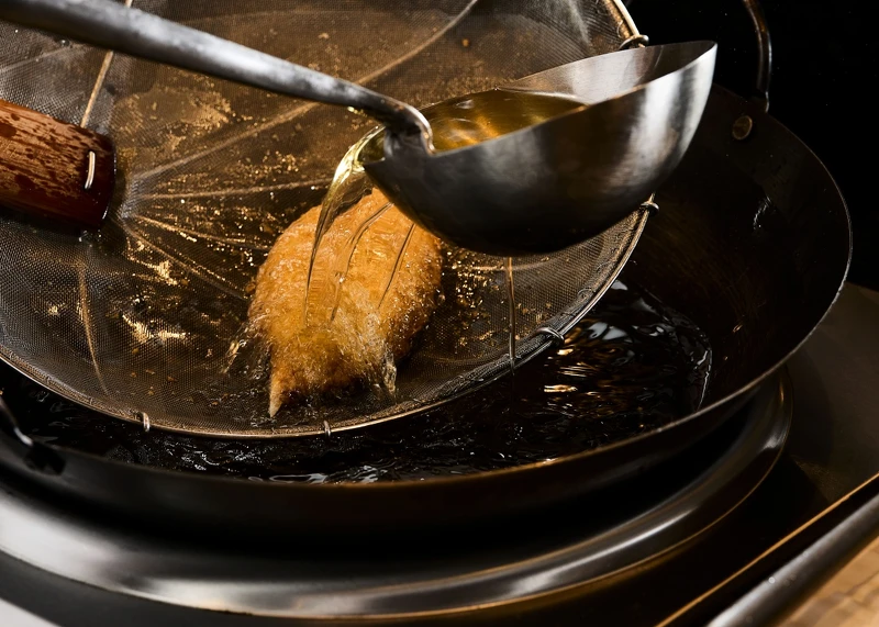 飽滿的蟹餡被回填入蟹蓋,裹以兩層蛋液和麵包粉,炸至內餡熱燙、外皮清爽。主廚在版前的料理檯上完成淋油動作,使滿室生香,蟹蓋入口時,香滑鮮甜的味道令人陶醉,能搭配鎮江醋使用,平衡了奶醬的厚重香氣。料理完美呈現出正統菜品的精細與華貴,讓人回味無窮。