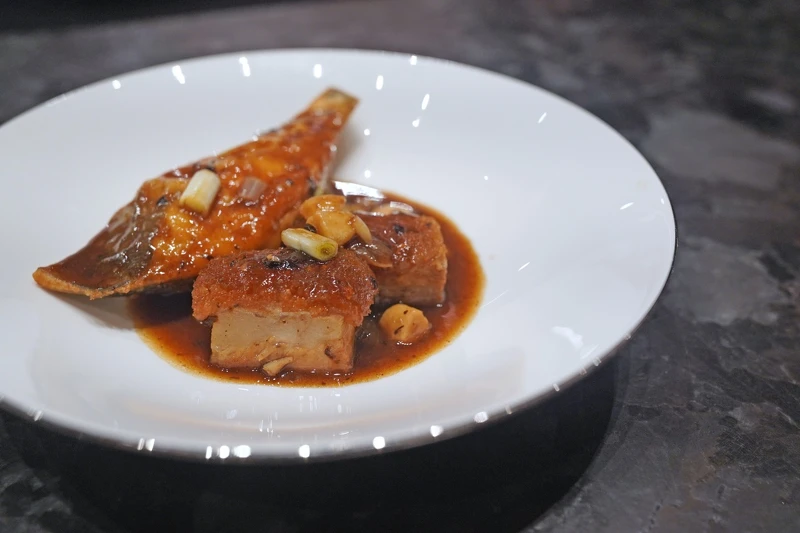 涼瓜即是苦瓜,具清熱解燥的功效,主廚選用來自屏東的蘋果苦瓜,外形圓潤且果香四溢,不如一般苦瓜苦澀,要先將苦瓜汆水去除苦澀,搭配上季節魚種,此次有來自南部海域的白鯧,要先調味裹上薄粉油炸至金黃酥脆。接著在油鍋中爆香蔥、蒜、豆豉醬,加入切件的火腩肉,然後放入魚球、苦瓜段及生抽、高湯等醬汁,以小火細炆煮,使食材充分入味。最後以大火收汁,讓魚肉滑嫩,成為鮮美的口感和獨特香氣的菜品。