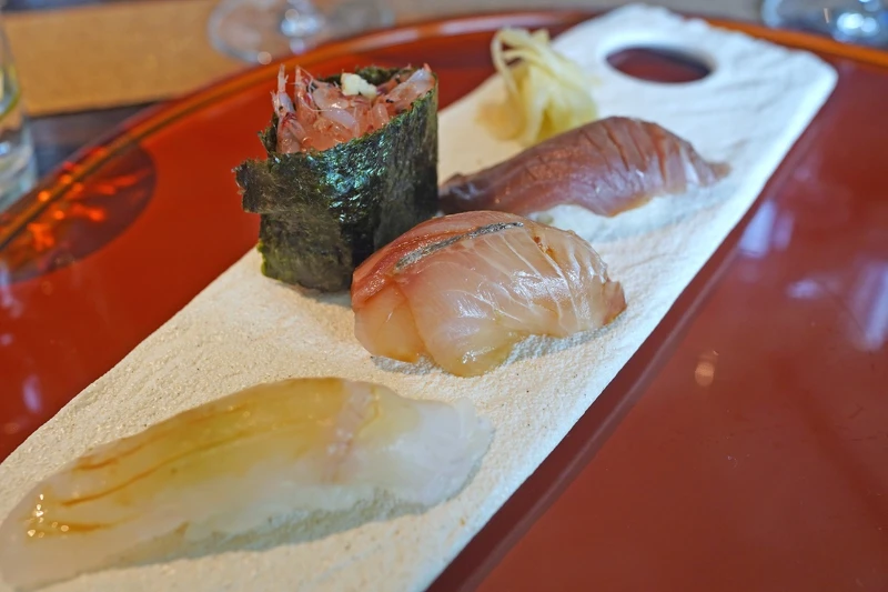除了來到餐會重現的「板前位置」上享用招牌的鮪魚大腹握壽司外,位置上也呈現綜合的壽司組合,包含了櫻花蝦、鰹魚、青甘、比目魚,同樣都搭配來自日本的七星米,同時展現了櫻花蝦獨特的甜味與口感、鰹魚緊實肥美、青甘的清爽、比目魚的細緻柔滑。