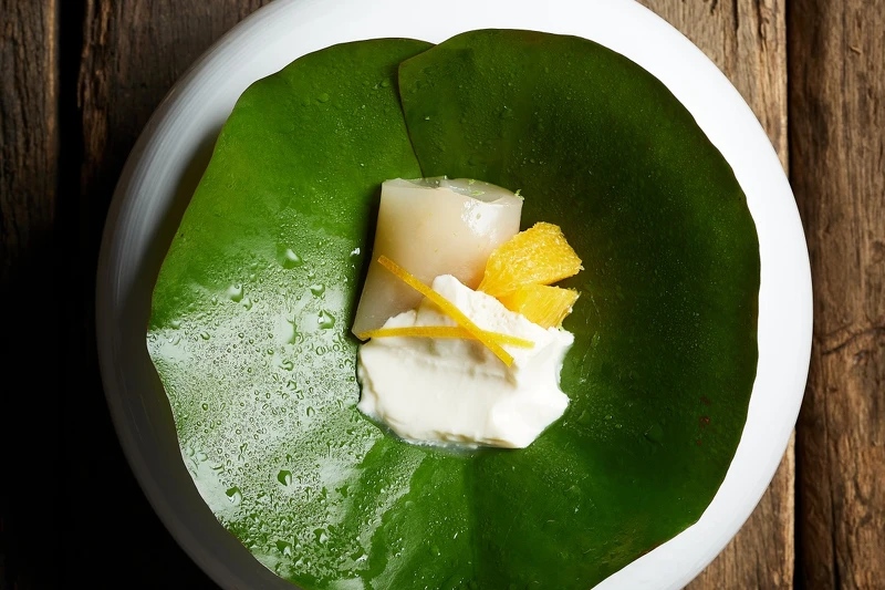 「蓮子麻糬」的靈感源自橋田主廚來到飛花落院,看見魚池內滿佈的荷花的景象所產生的靈感。他以豆漿卡士達搭配蓮子麻糬,並以柑橘點綴,完美展現蓮子一生週期,呈現季節變遷的美學。廚希望透過這道菜傳達蓮花的美好之處,如同日本武士精神中的「一會一會」,每一次相遇都是珍貴的,也同時呼應了他一向的款待之道。