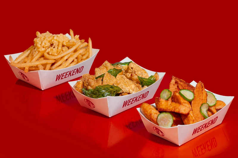 為了讓美食控可以在最短的時間內拿到熱騰騰的食物,「週末炸雞漢堡俱樂部」提供炸雞、漢堡、台式炸物等選擇,只要「黃金4分鐘」就能拿到一份現炸的美味炸雞。有別於美式炸雞的乾粉製法,週末炸雞漢堡俱樂部使用的是台式黃金濕漿,將台式香料、五香、白胡椒、朝天椒製作而成的濕漿,這樣更能突顯雞肉的風味。